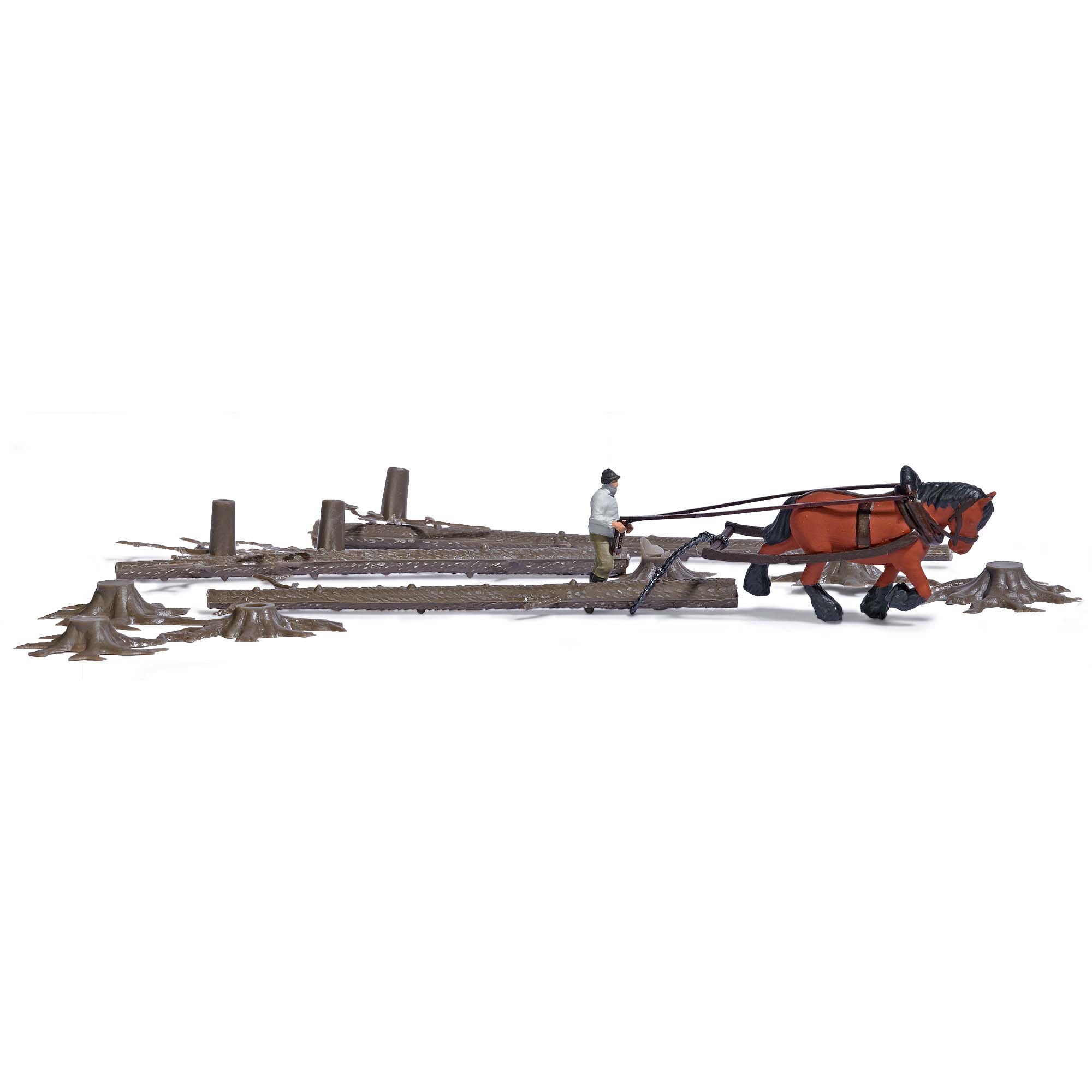 Pferdewirt mit Kaltblüter inklusive Rückeausrüstung und Baumstamm sowie lose Wurzeln,