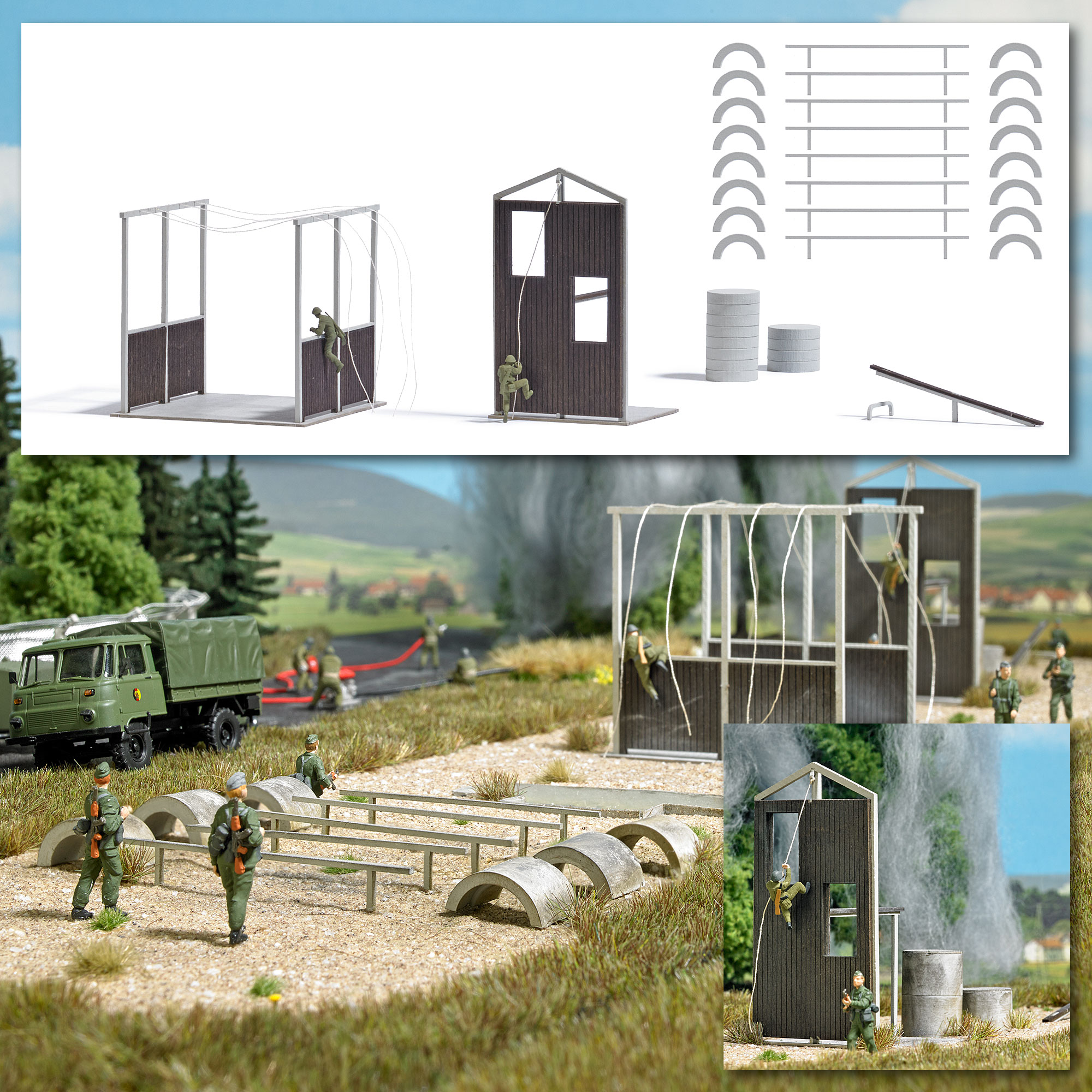 mit Horizontaltau, Giebelwand mit anschließendem Balken und Betonelementen sowie eine Wippe. Mit 2 NVA-Soldaten in verschiedenen Positionen zum selbst Bemalen. Empfohlene Aufbaulänge der Anlage: ca. 350 mm.
