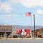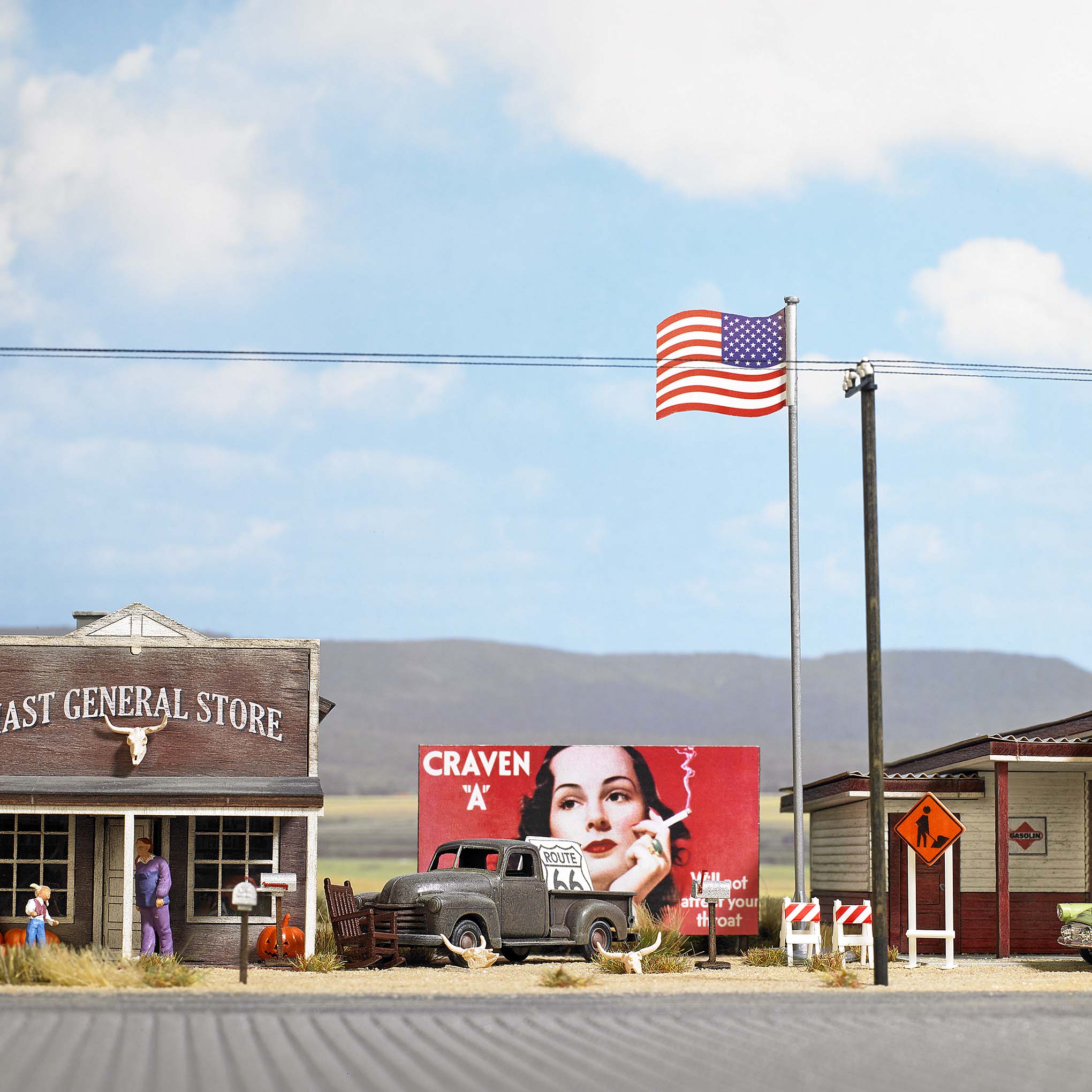 Fahnenhalter in verschiedenen Größen, Schaukelstuhl, zwei verwitterte Tierschädel sowie ein Chevrolet Pick-Up mit Werbeschild. Ausschneidebogen mit