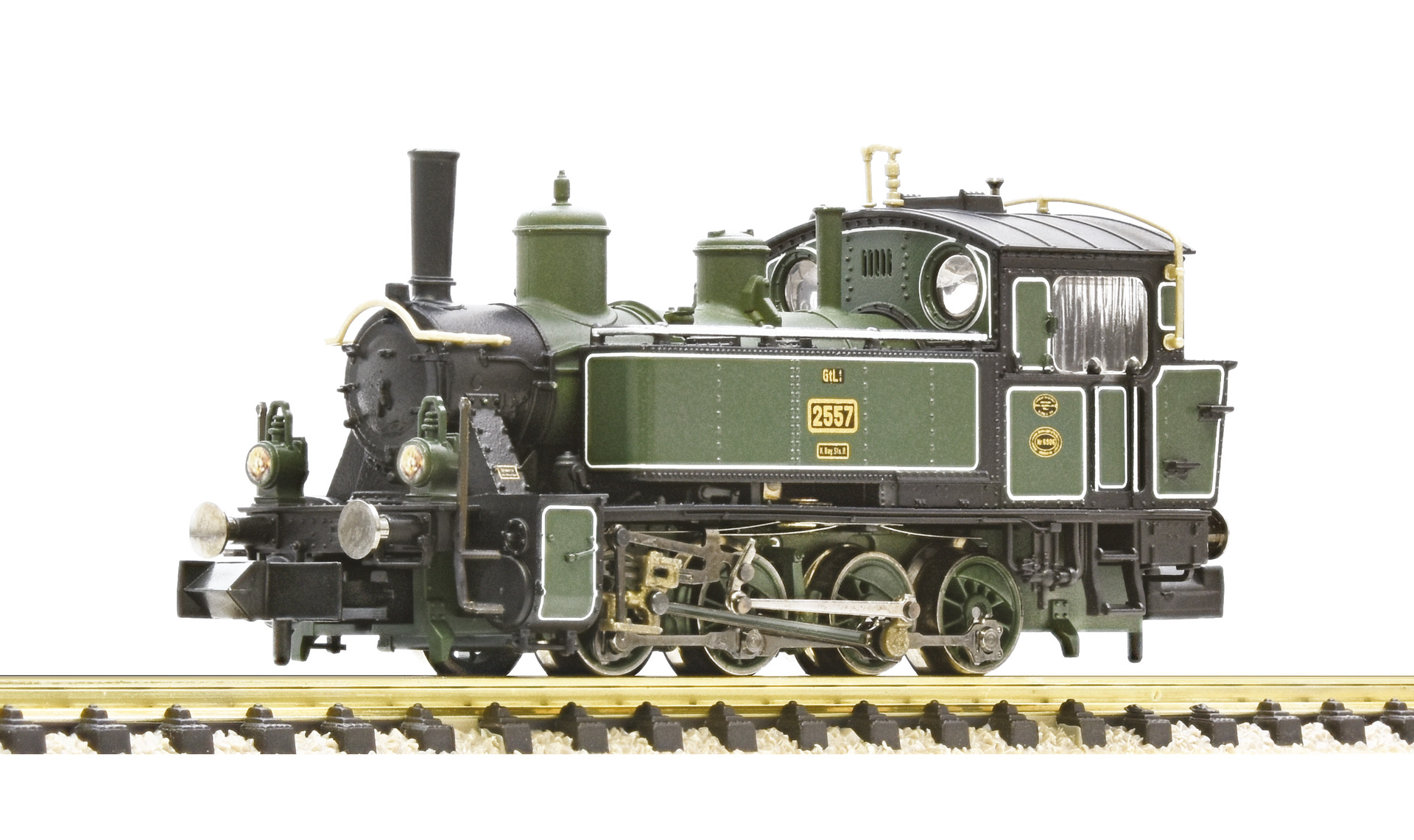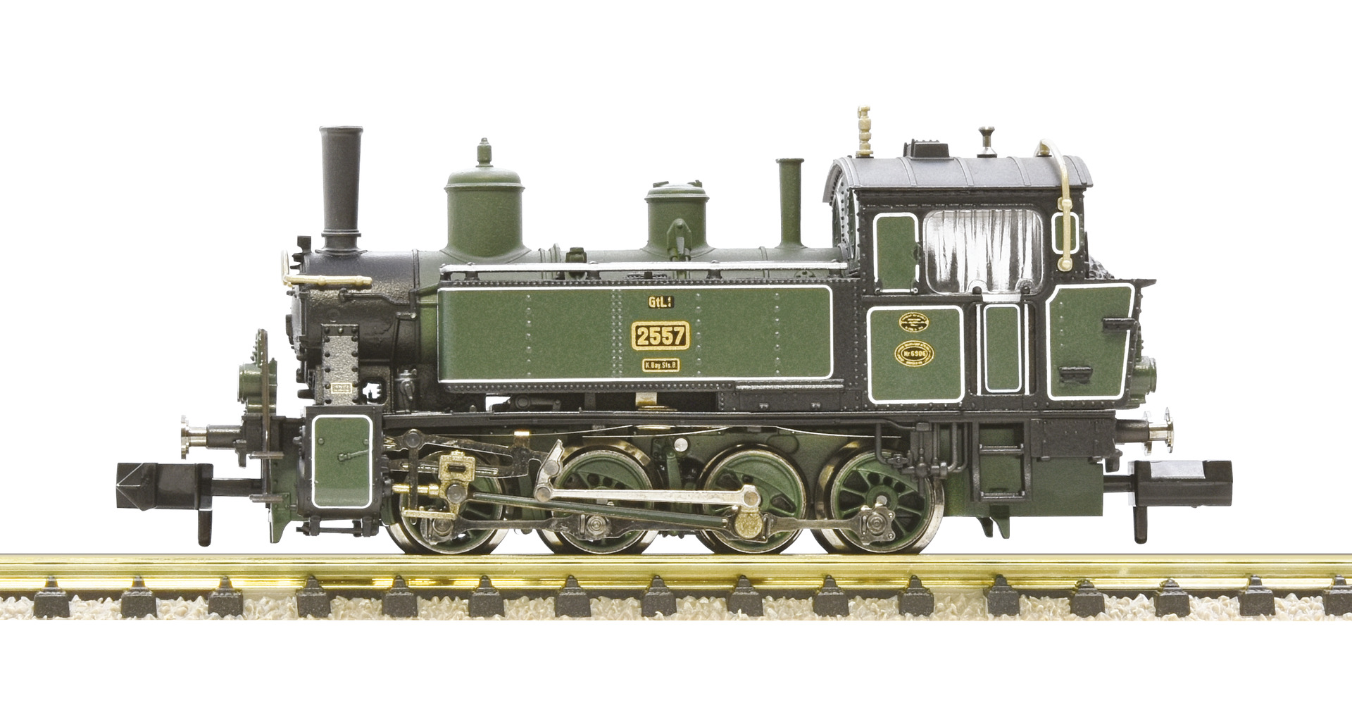 Dampflokomotive Gattung GtL 4/4 der Königlich Bayerischen Staats-Eisenbahnen. - Authentische Lackierung mit feinen Zierlinien - Einsatz vor Personen- und leichten Güterzügen auf Nebenbahnen - Metalldruckguss-Fahrgestell Die bayerische GtL 4/4 wurde erstmals 1911 in Dienst gestellt. Mit wenigen Änderungen wurde sie bis 1927 weitergebaut. Die Lokomotiven bewährten sich im Betrieb sehr gut und waren mit einer Leistung von 450 PS die stärksten bayerischen Lokalbahnlokomotiven. Insgesamt wurden 117 Lokomotiven hergestellt. Fast alle Bahnbetriebswerke in Bayern, die Nebenstrecken bedienten, hatten GtL 4/4 in ihrem Bestand.