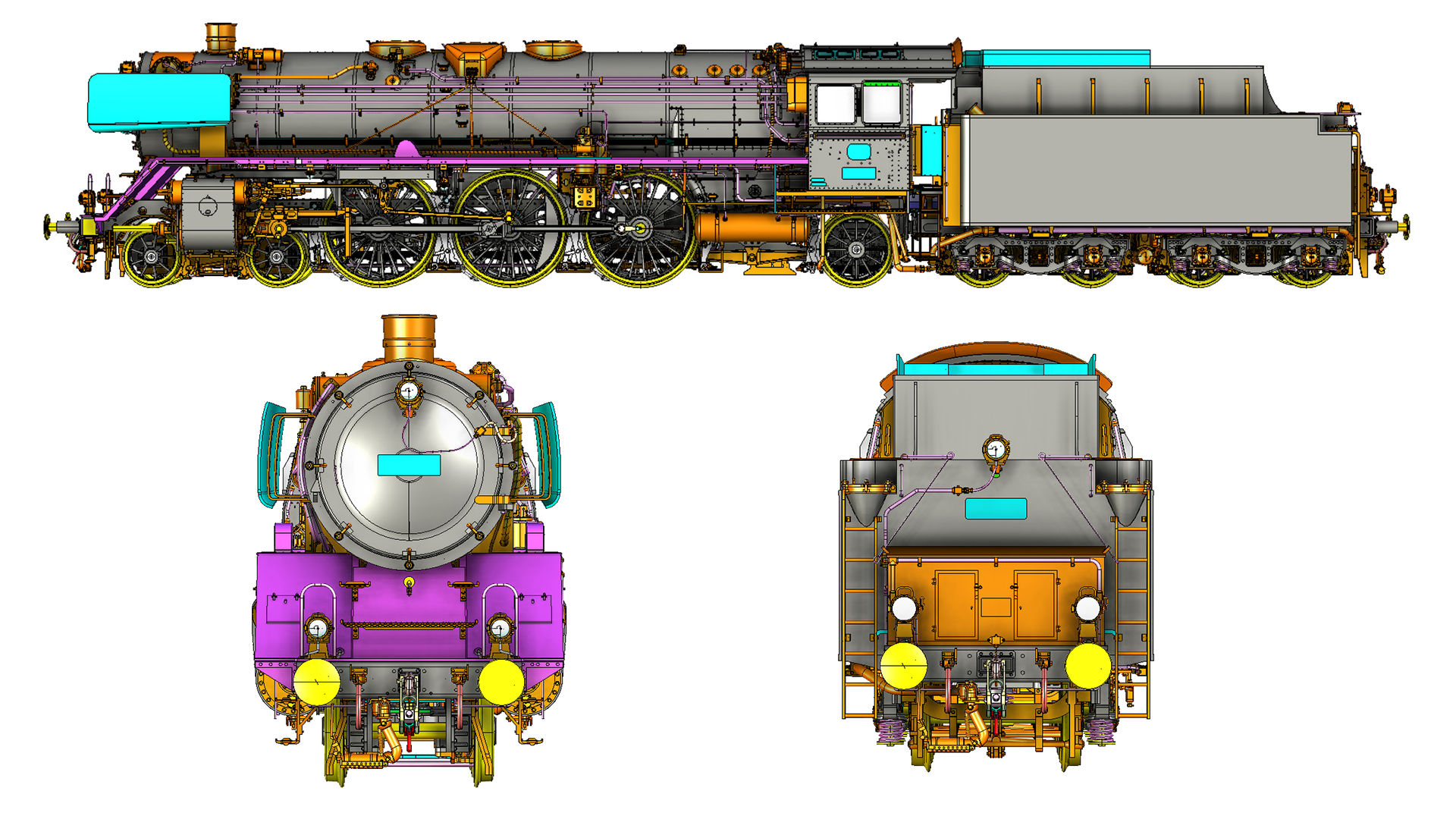Metallmodell aus Zinkdruckguss, Messing und Edelstahl, Bühler-Motor, Hochleistungs-Digitaldecoder mit realistischem KM1-HQ-Sound, Breitbandlautsprecher, Dynamic Smoke mit Zylinderdampf und Dampfpfeifeneuester Generation mit ca. 40 Minuten Laufzeit pro Füllung, servoelektronische Umsteuerung, Triebwerksbeleuchtung, Führerstandsbeleuchtung, Feuerbüchsenbeleuchtung, in Fahrtrichtung wechselndes Spitzenlicht, Warmlicht LED?s, rote Zugschlussbeleuchtung am Tender schaltbar, robuster Kardanantrieb mit rollfähigem und kugelgelagertem Getriebe, Antrieb und Achsen kugelgelagert und gefedert, Radreifen aus Edelstahl, Radsterne mit beidseitig elliptisch profilierten Speichen, Federpuffer, bewegliche Wasserkastendeckel, beweglich federnde Führerhaustüren, funktionsfähige Vorreiber und zu öffnende Rauchkammertüre, Schmierpumpenantrieb, detaillierter Führerstand, Schraubenkupplungen austauschbar gegen Funktionskupplungen, vorbildgerechte Lackierung und Beschriftung, Kinematik zwischen Lok und Tender für vorbildgerecht engen Kuppelabstand, Mindestradius 1020mm, LüP ca. 74,8 cm, Gewicht ca. 6,5 kg.