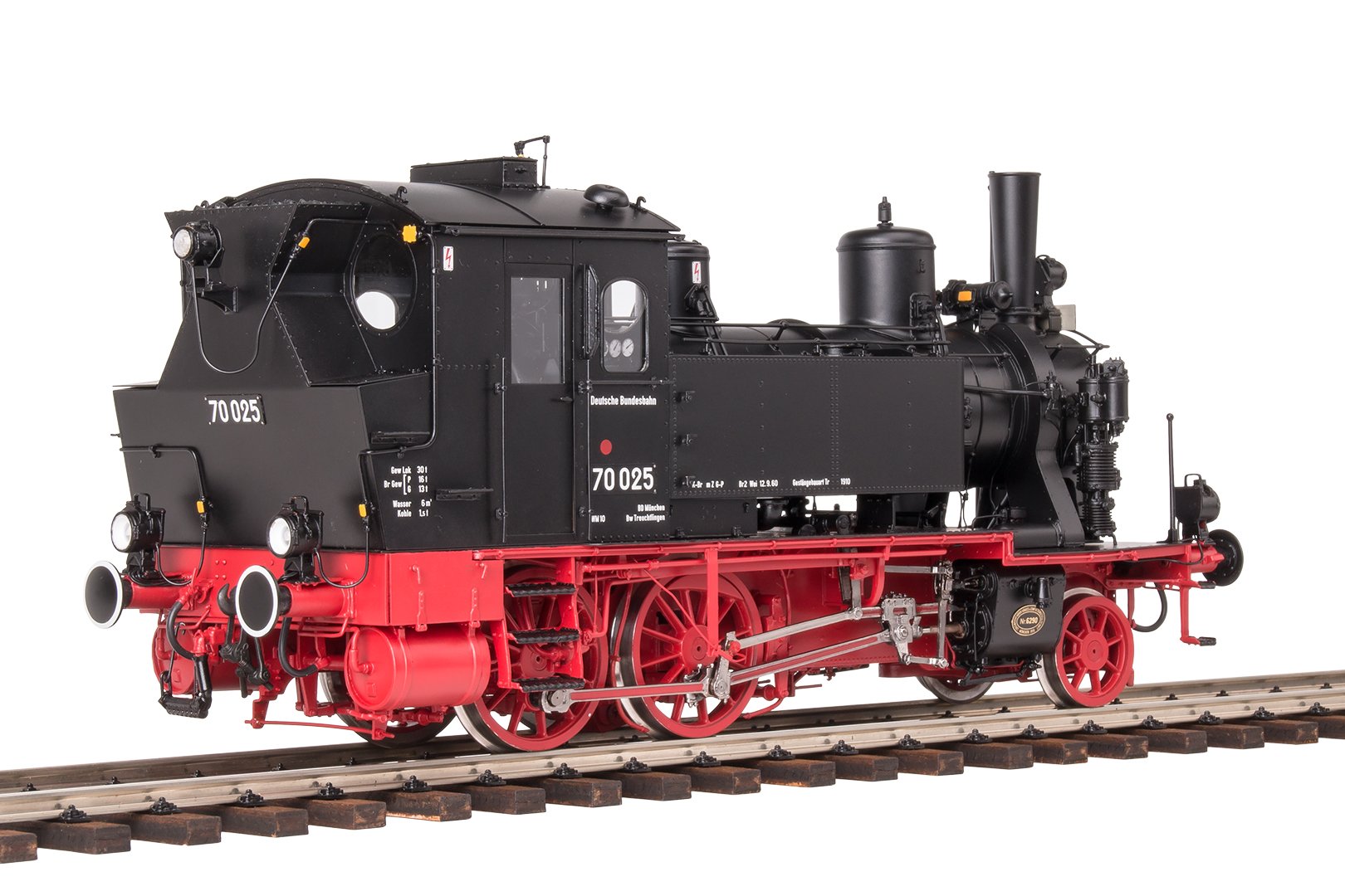 Kessel/Fahrwerk RAL 9005/3002, Spitzenlicht 2x DRG, hoher Kohlekastenaufsatz geschlossen, Glocke, Puffertellerwarnanstrich
