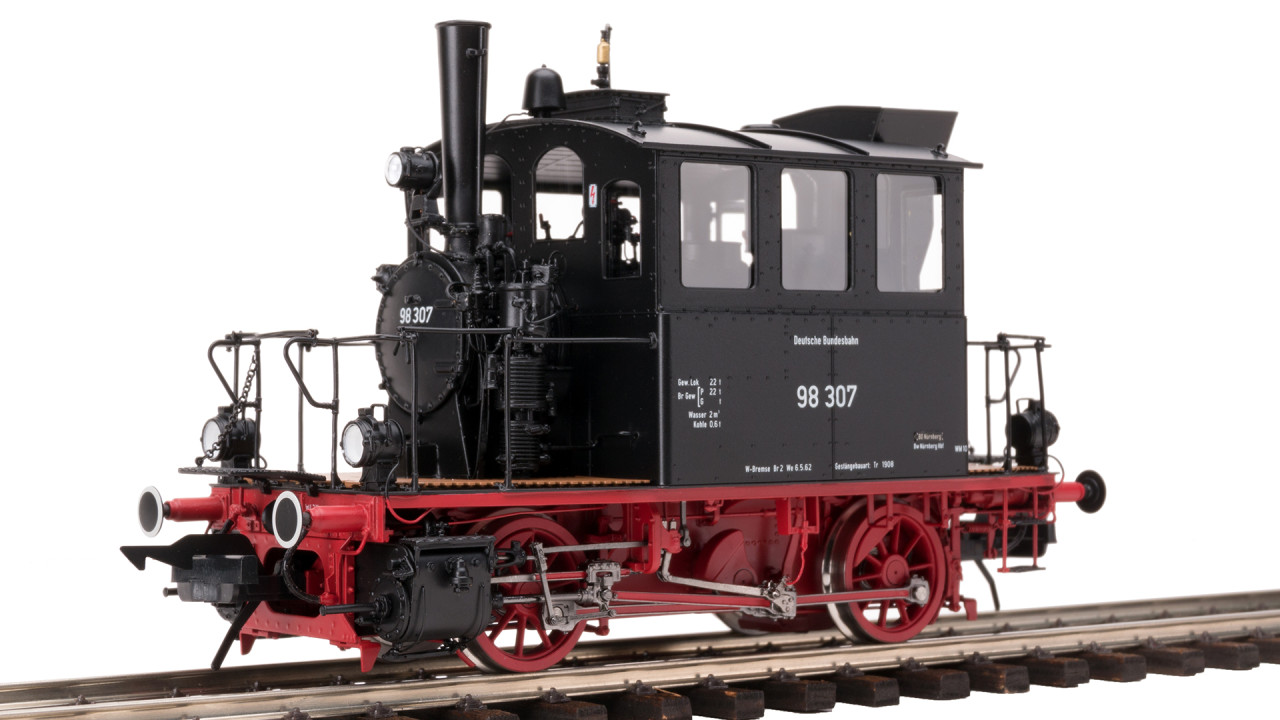 BD Nürnberg, Bw Nürnberg-Hbf. 2-fach DRG-Lampen + 1 DB-Lampe, 2-stufige Luftpumpe, mit Kohlekastenaufsatz Präzisionsmodell aus Messing und Edelstahl, Glockenankermotor, Multiprotokoll Decoder mit Energiespeicher und Hifi Soundmodul, radsynchroner Dynamic Smoke Rauchentwickler, verschleiß- und geräuscharme Stromaufnahme über Achslager, Führerstandsbeleuchtung, in Fahrtrichtung wechselndes Spitzenlicht, rote Zugschlußbeleuchtung unabhängig schaltbar, Warmlicht LED’s, robuster Kardanantrieb mit zährollendem und kugelgelagertem Getriebe, Antrieb und Achsen kugelgelagert und gefedert, Radreifen aus Edelstahl, Radsterne mit beidseitig elliptisch profilierten Speichen, Federpuffer, bewegliche Führerhaustüren, funktionsfähige Vorreiber und zu öffnende Rauchkammertüre, feinste nachgebildete Leitungen, detaillierter, mehrfarbig ausgelegter Führerstand, imitierte Holzroste (je nach Version), originalgetreue Schraubenkupplungen, austauschbar gegen kompatible Funktionskupplungen anderer Marken, optional digital fernsteuerbare Kupplungen, vorbildgerechte Lackierung und Beschriftung, Mindestradius 910 mm, Gewicht ca. 1,2 kg, LÜP ca. 15,6 cm, mit Lokführerfigur. Technische, optische und Detailänderungen vorbehalten Empfohlen für Modellbauer und Sammler ab 14 Jahren. Aufgrund maßstabs- und vorbildgerechter bzw. funktionsbedingter Gestaltung sind Spitzen, Kanten und Kleinteile vorhanden. Verschluckungsgefahr. Deshalb nicht in die Hände von Kindern unter 10 Jahren!