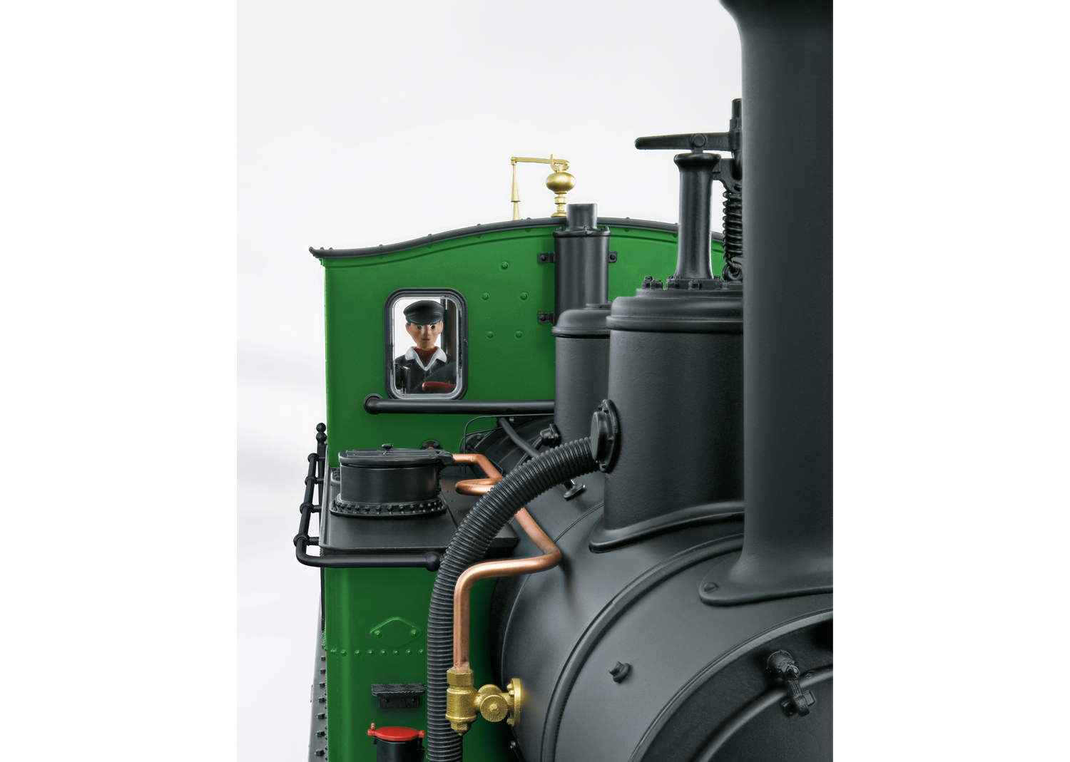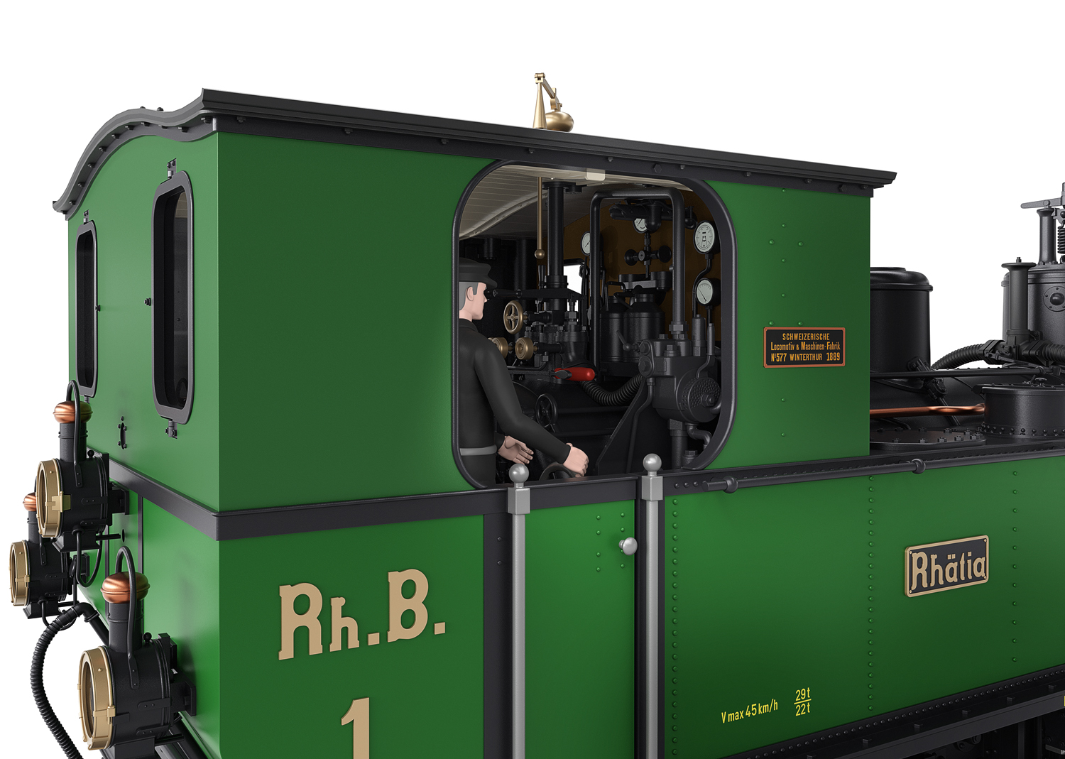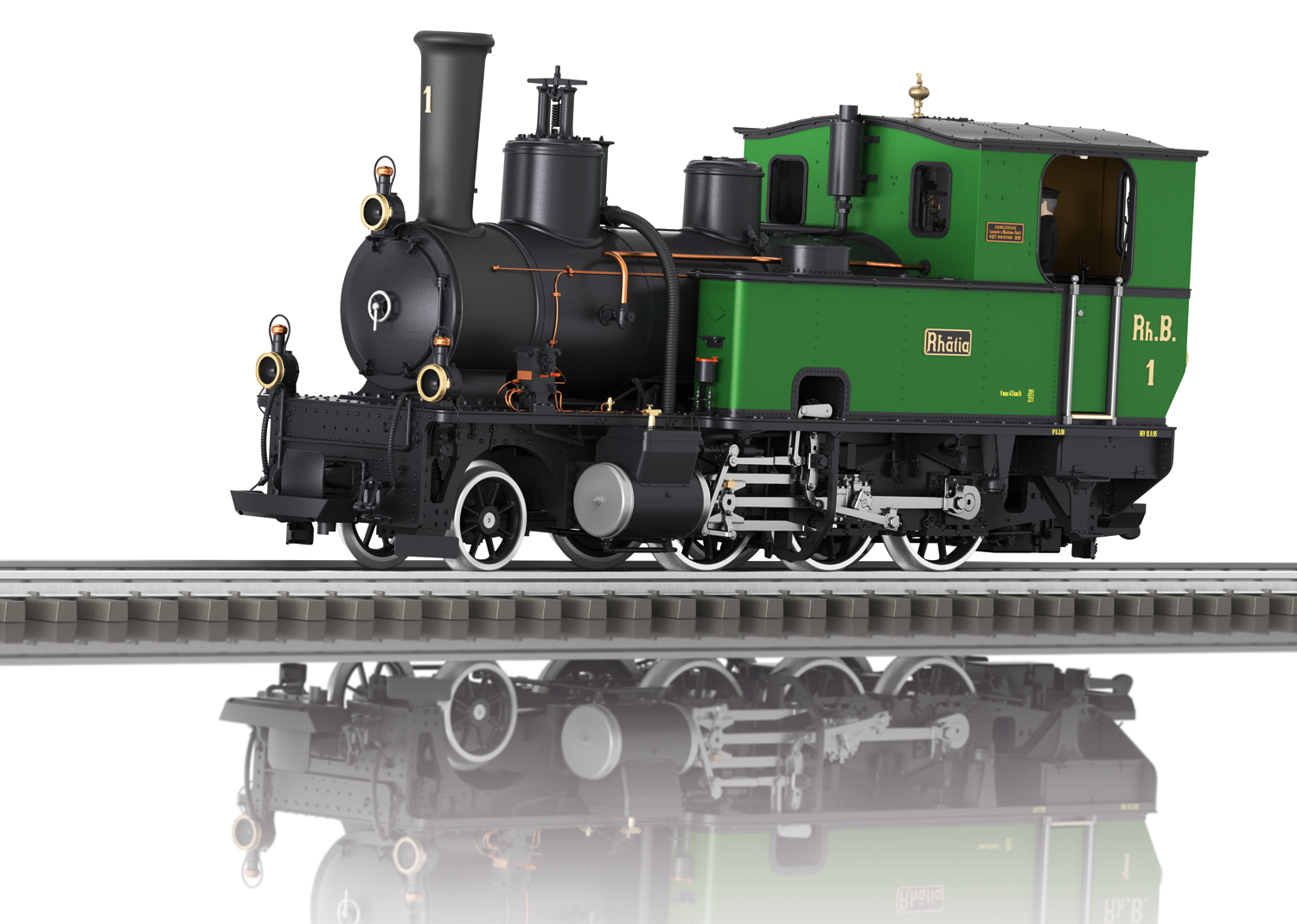 Dampflok G ¾ Rhätia Modell der Dampflok Rhätia, der ersten Lok der Rhätischen Bahn. Feindetailliertes Modell in schwerer Metallbauweise mit vielen angesetzten Details. Antrieb mit einem Hochleistungsmotor, alle Treibradsätze über Kuppelstangen angetrieben. Türen zum Führerstand und Rauchkammertür zum Öffnen, Führerstand mit kompletter Inneneinrichtung. Originalgetreue grün/schwarze Farbgebung und Beschriftung der Epoche VI, so wie die Lok bis 2014 im Einsatz war. Ausgerüstet mit einem mfx/DCC-Decoder mit vielen Licht- und Soundfunktionen wie Spitzenlicht, Führerstandsbeleuchtung, Fahrgeräusch, durch Reedschalter auslösbare Pfeife und vieles mehr. Die hintere Kupplung kann im Digitalbetrieb ferngesteuert betätigt werden. Fahrgeräusch auch im Analogbetrieb funktionsfähig. Eingebauter Rauchgenerator mit radsynchronem Dampfausstoß sowie Zylinderdampf, Dampf am Auspuff der Vakuumbremse und Dampfausstoß an der Pfeife, wenn diese betätigt wird. Länge über Puffer 35 cm. Die Rhätia wurde als erste Lok der damaligen Landquart-Davos-Bahn als LD 1 im Jahre 1889 von der SLM in Winterthur abgeliefert. Mit einer Leistung von 250 PS entsprach die 30 Tonnen schwere und 45 km/h schnelle Lok dem damaligen Stand der Technik und wurde im normalen Zugdienst eingesetzt. Doch bald schon wurden die kleinen Loks der Baureihe G ¾ von stärkeren Maschinen in weniger anspruchsvolle Dienste verdrängt, bis sie nach der vollständigen Elektrifizierung des Netzes der RhB Anfang der 20er-Jahre entbehrlich wurden. 1928 wurde die Lok Nr. 1 ausgemustert und für ein geplantes Schweizer Eisenbahnmuseum vorgesehen. 1970 kam die Lok zur Museumsbahn Blonay-Chamby in der Westschweiz, wo sie abgestellt aufbewahrt wurde. Im Vorgriff auf das 100-jährige Jubiläum der RhB kam die Lok 1988 zurück zur RhB, wurde dort betriebsfähig wieder aufgearbeitet und beim Jubiläum 1989 vor Sonderzügen eingesetzt. Auch in den folgenden Jahren wurden regelmäßig Sonderzüge mit der Rhätia bespannt, bis sie 2014 wegen Fristablauf abgestellt wurde. Um die Lok wieder instand zu setzen, gab es viele Spendenaufrufe, auch mit entsprechenden Modellen – so wird die Lok weiter als Zeugnis aus der Anfangszeit der RhB dienen können. mfx/DCC-Decoder.Hochleistungsmotor.Spitzenlicht digital schaltbar.Mit Sound.Highendmodell aus Metall.Originalgetreue Farbgebung. Fahrgeräusch auch im Analogbetrieb funktionsfähig Dampfausstoß an der Vakuum-Bremse und Pfeife sowie Zylinderdampf und radsynchroner Dampfausstoß am Schornstein