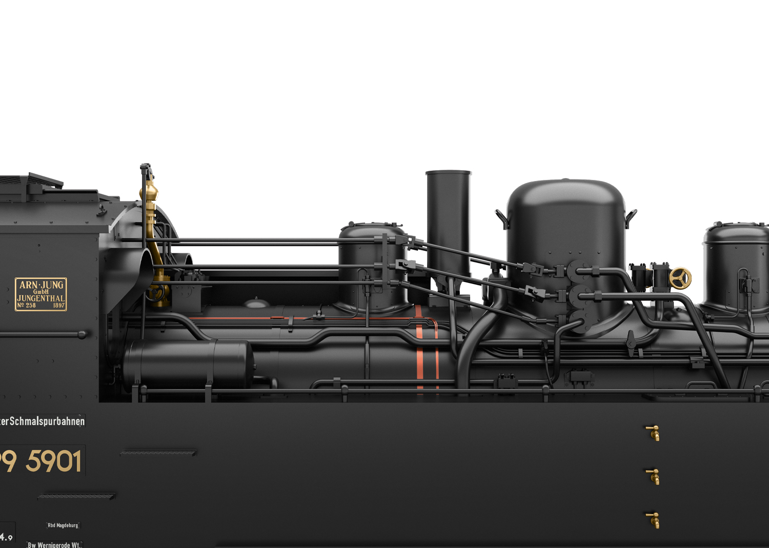 HSB Dampflok 99 5901 - Die Nordhausen-Wernigeroder Eisenbahngesellschaft (NWE) stellte in den Jahren 1897 bis 1900 eine Serie von zwölf Mallet-Loks in Dienst, von denen neun von der Fa. Jung in Jungenthal gebaut wurden, weitere drei wurden von der Mecklenburgischen Waggonfabrik-Aktiengesellschaft in Güstrow geliefert. Die Loks waren sehr zuverlässig, mit ihrer Leistung von 255 PS und ihrer Höchstgeschwindigkeit von 30 km/h erfüllten die 34 Tonnen schweren Loks alle an sie gestellten Anforderungen. Allerdings mussten im ersten Weltkrieg sechs Maschinen an die Heeresfeldbahnen abgegeben werden – von diesem Einsatz kamen sie nie zurück. Eine weitere Lok musste nach einem schweren Unfall ausgemustert werden, so dass die verbleibenden fünf Loks 1949 von der DR als 99 5901 bis 99 5905 übernommen wurden. Nachdem Mitte der 1950er-Jahre die Neubauloks in den Harz kamen, gelangten die Mallet-Loks auf die Selketalbahn. Die 99 5904 und 99 5905 wurden verschrottet, die anderen 3 Loks blieben im Bestand. Bei der HSB wurden die 99 5901 und 99 5902 noch längere Zeit eingesetzt, heute stehen diese beiden – und die 99 5903 – nicht mehr betriebsfähig in Wernigerode.Modell der Dampflok 99 5901 der Harzer Schmalspurbahnen. Feindetailliertes Modell in schwerer Metallbauweise mit vielen angesetzten Details. Antrieb mit zwei Hochleistungsmotoren, alle Treibradsätze über Kuppelstangen angetrieben. Türen zum Führerstand und Rauchkammertür zum Öffnen. Feindetailliertes Fahrwerk der Bauart Mallet mit vielen Details wie komplettes Gestänge und Antrieb der Schmierpumpe. Originalgetreue schwarz/rote Farbgebung und Beschriftung der Epoche VI, so wie die Lok heute noch bei der HSB vorhanden ist. Ausgerüstet mit einem mfx/DCC-Decoder mit vielen Licht- und Soundfunktionen wie Spitzenlicht, Führerstandsbeleuchtung, Triebwerksbeleuchtung, Fahrgeräusch, durch Reedschalter auslösbare Pfeife und Glocke sowie vieles mehr. Fahrgeräusch auch im Analogbetrieb funktionsfähig. Eingebauter Rauchgenerator mit radsynchronem Dampfausstoß sowie Zylinderdampf und Dampfausstoß an der Pfeife, wenn diese betätigt wird. An beiden Enden digital schaltbare LGB-Systemkupplungen, diese können demontiert werden. Federpuffer. Länge über Puffer 40 cm.