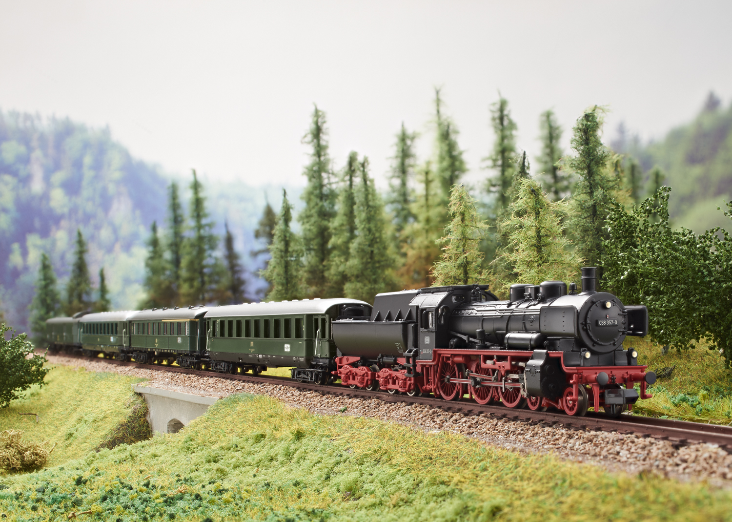 Vorbild: Personenzuglokomotive 038 357-0 (Baureihe 38.10-40) der Deutschen Bundesbahn (DB). Ehemalige preußische P 8. Kessel mit 3 Domen und Witte-Windleitblechen. Wannentender 2´2´T 30. Modell: Lok und Tender überwiegend aus Metalldruckguss. Glockenankermotor mit Schwungmasse im Kessel. Eingebauter Digital-Decoder und Geräuschgenerator mit den Formaten mfx und DCC. Lok und Tender kurzgekuppelt. 3 Achsen angetrieben. Haftreifen. 3-Licht-Spitzensignal mit warmweißen LEDs. Länge über Puffer 114 mm. Einmalige Serie.