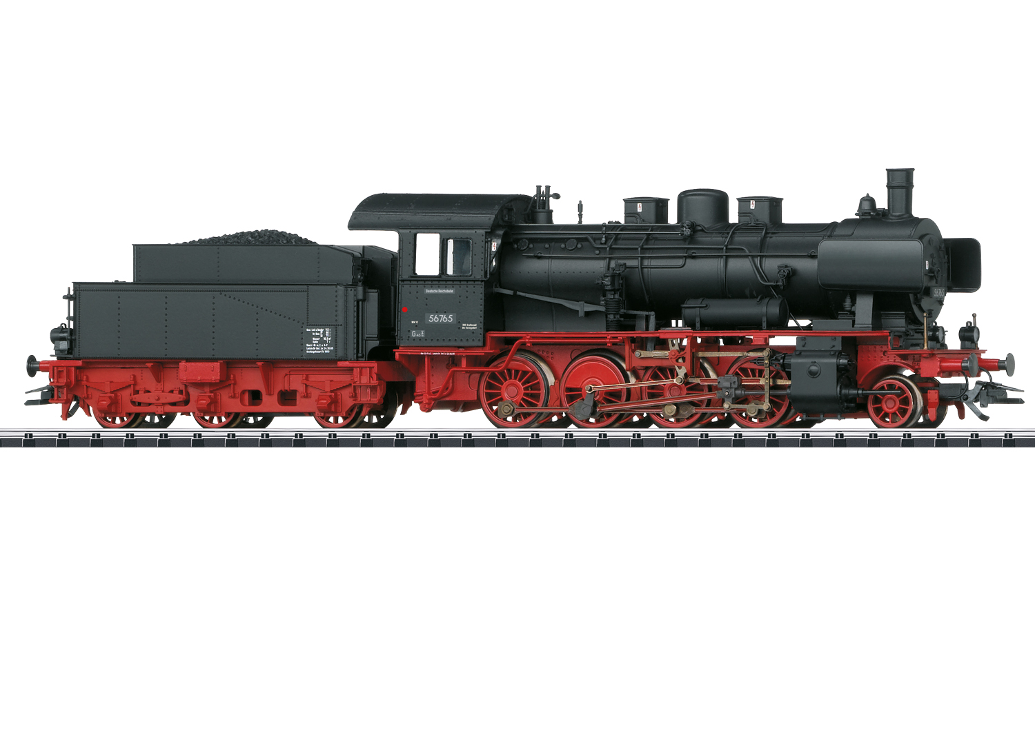 Dampflokomotive BR 56 - Modell: Mit multiprotokollfähigem Digital-Decoder und umfangreichen Geräuschfunktionen. Geregelter Hochleistungsantrieb mit Schwungmasse im Kessel. 4 Achsen angetrieben. Haftreifen. Lokomotive und Tender weitgehend aus Metall. Vorbereitet für Rauchsatz 72270. Fahrtrichtungsabhängig wechselndes Zweilicht-Spitzensignal und Rauchsatzkontakt konventionell in Betrieb, digital schaltbar. Beleuchtung mit warmweißen Leuchtdioden (LED). Angesetzte Windleitbleche. Feste Kurzkupplung mit Kinematik zwischen Lok und Tender. Hinten am Tender und vorne an der Lok Kurzkupplung mit NEM-Schacht. Viele separat angesetzte Details wie Leitungen und Sandfallrohre. Kolbenstangenschutzrohre, Bremsleitungen, Schraubenkupplungsimitation sowie ein Schiebebildsatz zur vorbildgerechten Beschriftung der Windleitbleche liegen bei.Länge über Puffer 21,1 cm. Vorbild: Güterzug-Dampflokomotive der Baureihe 56.2-8 der Deutschen Reichsbahn (DR) der DDR. Umgebaute preußische G 8.1 mit Vorlaufachse. Mit Reichsbahn-Lampen und Läutewerk. Kohlen-Schlepptender der Bauart 3T 16,5. Betriebsnummer 56 765. Betriebszustand um 1966. Die Lok 56 765 war von 1956 bis 31. Januar 1967 im Seebad Heringsdorf auf Usedom beheimatet (Rbd Greifswald).Sie hatte in den 1960er Jahren unterschiedliche Kessel, wie von Fotos bekannt ist. Den Kessel mit den direkt aufeinander folgenden Aufbauten bekam 56 765 bei einer L 4 im Oktober 1965 in Leipzig. Mit diesem Kessel war sie noch 1969 im Einsatz. Ein passendes Güterwagen-Set finden Sie unter der Artikelnummer 24075. Dieses Modell finden Sie in Wechselstromausführung im Märklin H0-Sortiment unter der Artikelnummer 37509. Lokomotive erstmalig mit WindleitblechenNeu entwickelte RauchkammertüreVorbildgerechte Änderungen der LeitungsführungMit Digital-Decoder mfx und umfangreichen Betriebs- und Geräuschfunktionen Windumtoster Einzelgänger Ein absolutes Unikat bildet die 56 765 der DDR-Reichsbahn. Sie entstand im Juni 1939 durch Umbau der ex-preußischen G 8.1 (DRG 55 4131) durch die DRG, um die Laufeigenschaften des Vierkupplers durch ein vorauslaufendes Bissel-Gestell zu verbessern und die Geschwindigkeit auf 70 km/h zu erhöhen. Nach dem Zweiten Weltkrieg verblieb sie bei der DR der DDR und leistete in den 1960er Jahren Dienst beim Bw Heringsdorf auf der Insel Usedom im Personen- und Güterverkehr. Dort erhielt sie sogar ausnahmsweise Windleitbleche wegen des zum Teil starken, seeseitigen Windes. Die Aufschrift äLok Brigade Fritz Reuter“ zeigt die besondere Pflege der Lok durch diese Brigade und erinnert an den im 19. Jahrhundert lebenden plattdeutschen Schriftsteller und Demokraten Fritz Reuter.