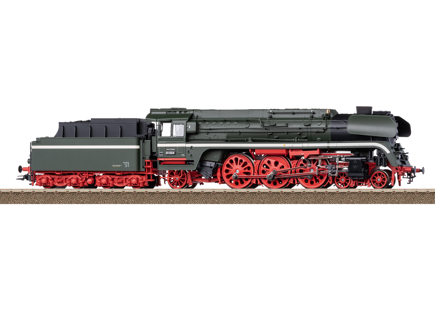 Dampflokomotive Baureihe 01.5 - Vorbild: Schnellzug-Dampflokomotive Baureihe 01.5, mit Kohlen-Schlepptender 2´2´T34. Reko-Ausführung der Deutschen Reichsbahn der DDR (DR/DDR). Dunkelgrüne Grundfarbgebung mit weißen Zierstreifen. Mit Boxpok-Räder, Witte-Windleitblechen in spezieller Bauform für die BR 01.5, durchgehender Domverkleidung und seitlicher Verkleidung der Umlaufbleche. Lok-Betriebsnummer 01 504. Betriebszustand um 1964.Modell: Mit Digital-Decoder und umfangreichen Licht- und Geräuschfunktionen. Geregelter Hochleistungsantrieb mit Schwungmasse im Kessel. 3 Achsen angetrieben. Haftreifen. Lokomotive und Tender weitgehend aus Metall. Eingerichtet für Rauchsatz 7226. Fahrtrichtungsabhängig wechselndes Dreilicht-Spitzensignal und nachrüstbarer Rauchsatz konventionell in Betrieb, digital schaltbar. Führerstandbeleuchtung zusätzlich digital schaltbar. Beleuchtung mit wartungsfreien warmweißen Leuchtdioden (LED). Kurzkupplung mit Kinematik zwischen Lok und Tender. Am Tender kinematikgeführte Kurzkupplung mit NEM-Schacht. Befahrbarer Mindestradius 360 mm. Kolbenstangenschutzrohre und Bremsschläuche liegen bei. Länge über Puffer 28,2 cm.Dieses Modell finden Sie in Wechselstromausführung im Märklin H0-Sortiment unter der Artikelnummer 38205.