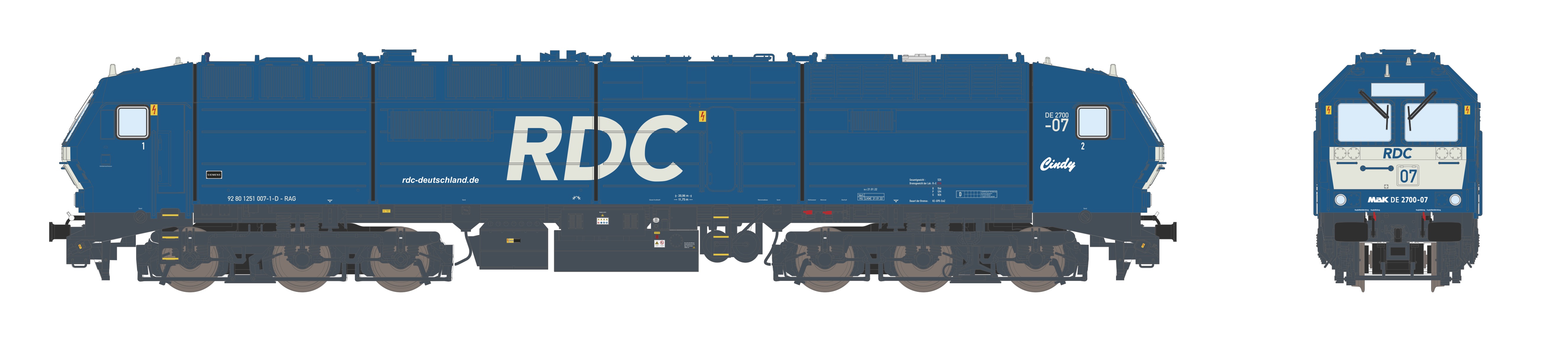 Zur Beförderung von Güterzügen sowie dem Alpen-Sylt-Express erwarb RDC 2021 von Hectorrail eine Diesellok der Baureihe DE2700 zusätzlich zu vorhandenen Loks der gleichen Baureihe. Diese Lokomotive wurde in die Hausfarben von RDC umlackiert und erhielt den Namen ?Cindy?, zu Ehren der Ehefrau des Gründers und Eigentümers von RDC, Henry Posner III.