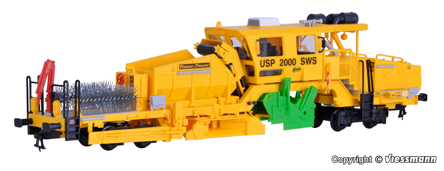 Bausatz. Vorbilddaten: LüP 19 m, Drehzapfenabstand 11,5 m, Gesamtmasse 55 t, Motorleistung ca. 400 kW, max. Fahrgeschwindigkeit 100 km/h. Maschine mit 2 2-achsigen Drehgestellen für Gleise und Weichen mit Schottersilo, ausgestattet mit einem geteilten Mittelpflug. Geeignet zum Pflügen in Gleisen mit Linienleiter, wobei der Schotterfluss über einen Symboltaster genau dosiert werden kann. Der Flankenpflug bringt den Schotter aus dem Bereich der Bettungsflanke zur Bettungskrone. Kehrvorrichtung mit reversiblem Querförderband zur Ablagerung des überschüssigen Schotters an einer Bettungsflanke. Steilförderband, Schottersilo mit Bodenförderband und Verteileinrichtungen dienen zur Speicherung und Wiedereinbringung von Schottermaterial. Hydrostatischer Fahrantrieb auf allen Achsen, UIC-Bremsen, Großraumkabine mit Führerständen und Frontscheiben aus Sicherheitsglas. Der richtig definierte Bettungsquerschnitt ist vor allem für die Sicherung der Gleislage gegen Verwerfungen wichtig. Die richtige Verteilung des Schotters im Gleis sowie die Rückgewinnung von der Flanke ist ein Faktor höchster Wirtschaftlichkeit. Die Bearbeitung der Bettungsoberfläche, insbesondere an den Flanken, wirkt sich auch günstig gegen Pflanzenbewuchs im Bettungsbereich aus. Dabei handelt es sich in erster Linie um eine rein mechanische Beeinflussung der Schotteroberfläche. Auf Schnellfahrstrecken ist die Bearbeitung der Schwellenoberflächen und der Zwischenfächer durch gründliches Abkehren wichtig, um das Aufwirbeln von Schottersteinen aufgrund der hohen Geschwindigkeiten zu verhindern. Mit NEM-Schacht. Maße: LüP 21,8 x B 4,2 - 6,5 x H 5,2 cm. Schwierigkeitsgrad: 3 (Profis).