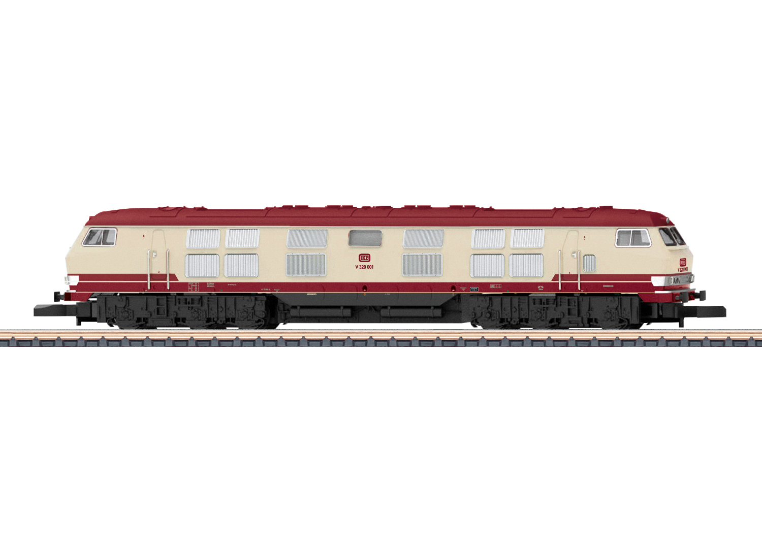 Diesellokomotive Baureihe 232 - Vorbild: Schwere Diesellokomotive Baureihe 232 der Deutschen Bundesbahn (DB). In fiktiver TEE-Farbgebung. Zum Einsatz im hochwertigen TEE-Reisezugverkehr. Lok-Betriebsnummer 232 001-8. Betriebszustand Anfang der 1970er Jahre.Modell: Weitgehend überarbeitetes Modell mit vielen Verbesserungen. Fahrwerk aus Metall, Aufbau aus Kunststoff. Beide Drehgestelle angetrieben. Glockenankermotor.Fahrtrichtungsabhängig wechselndes LED-Spitzensignal 3 x warmweiss/2 x rot. Maschinenraumbeleuchtung und -imitation. Hoher Detaillierungsgrad mit feiner und aufwendiger Farbgebung und Beschriftung.Gute Zugkraft durch hohes Fahrzeuggewicht. Angesetzte Griffstangen. Länge über Puffer ca. 105 mm.