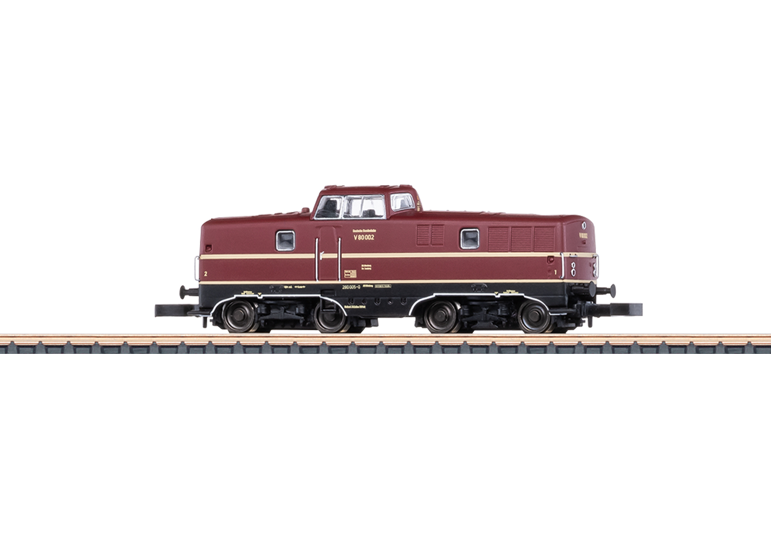 Streckendiesellokomotive V 80 002 - Vorbild: Museums-Mehrzweck-Diesellokomotive Baureihe V 80 der Deutschen Bahn (DB) in roter Grundfarbgebung. Ausführung mit einer Einzellampe oben und Doppellampen unten. Im Betriebszustand wie die Lok im Jahr 2000 im DB-Museum Nürnberg ausgestellt wurde. Modell: Ausführung der Epoche III mit runden Metallpuffern. Fahrwerk aus Metall/Kunststoff, Aufbau aus Kunststoff. Vergrößerte Pufferteller. Alle Achsen angetrieben, Glockenankermotor, Dreilicht-Spitzenbeleuchtung mit warmweissen LEDs mit der Fahrtrichtung wechselnd. Dunkel vernickelte Radkränze. Nachbildung Führerstandseinrichtung. Länge über Puffer ca. 58 mm.Verpackt in einer Echtholzbox.