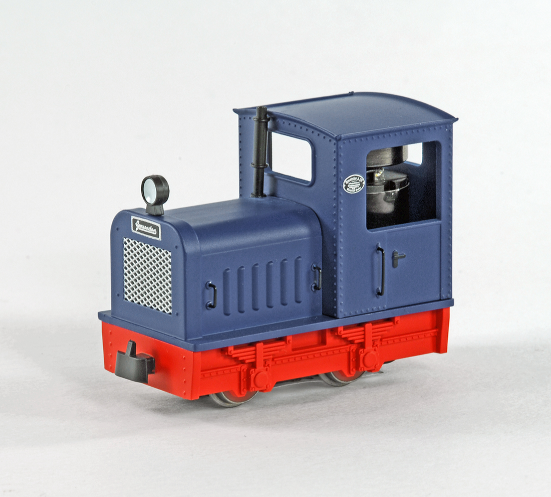 Gmeinder Diesellok in blau mit rotem Fahrwerk.