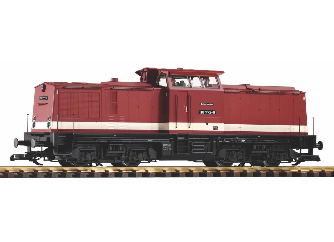 Diesellokomotive Baureihe 110 im klassischen Rot der DR, Ausführung der Epoche IV. Der Antrieb wirkt auf alle Achsen eine Digital-Schnittstelle zur Aufnahme eines Decoders ist vorhanden. Das Dreilicht-Spitzenbeleuchtung, ist mit der Fahrtrichtung wechselnd.