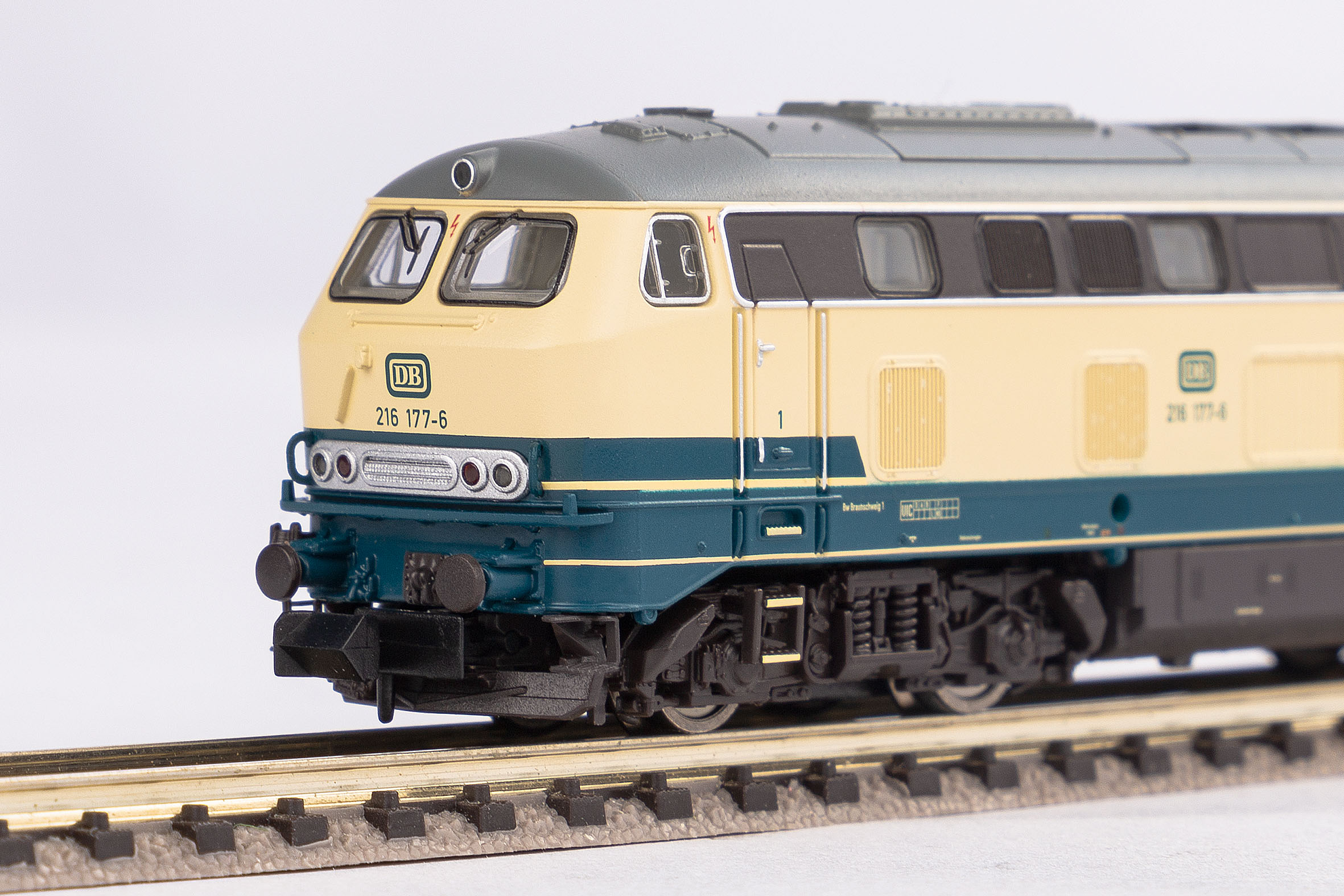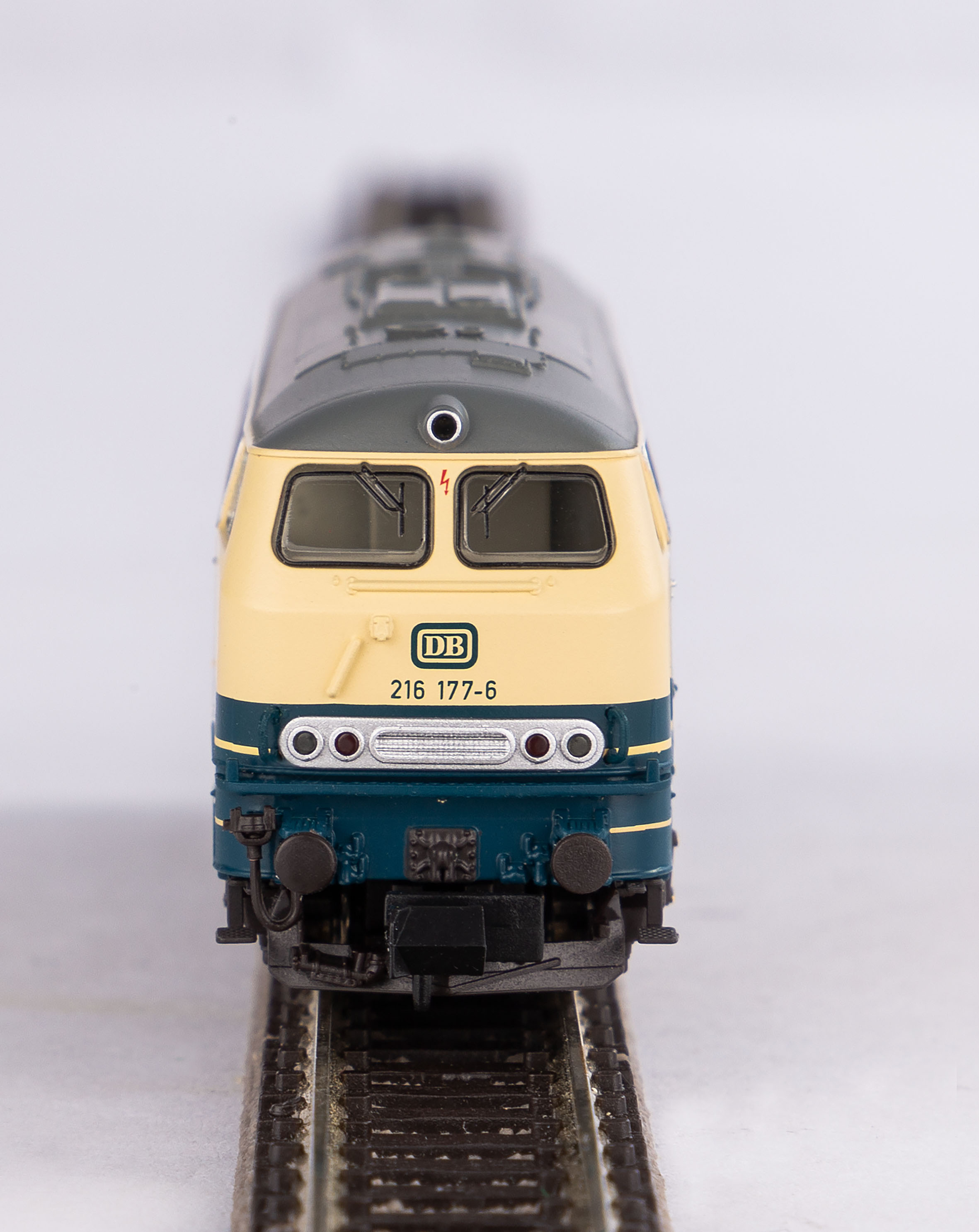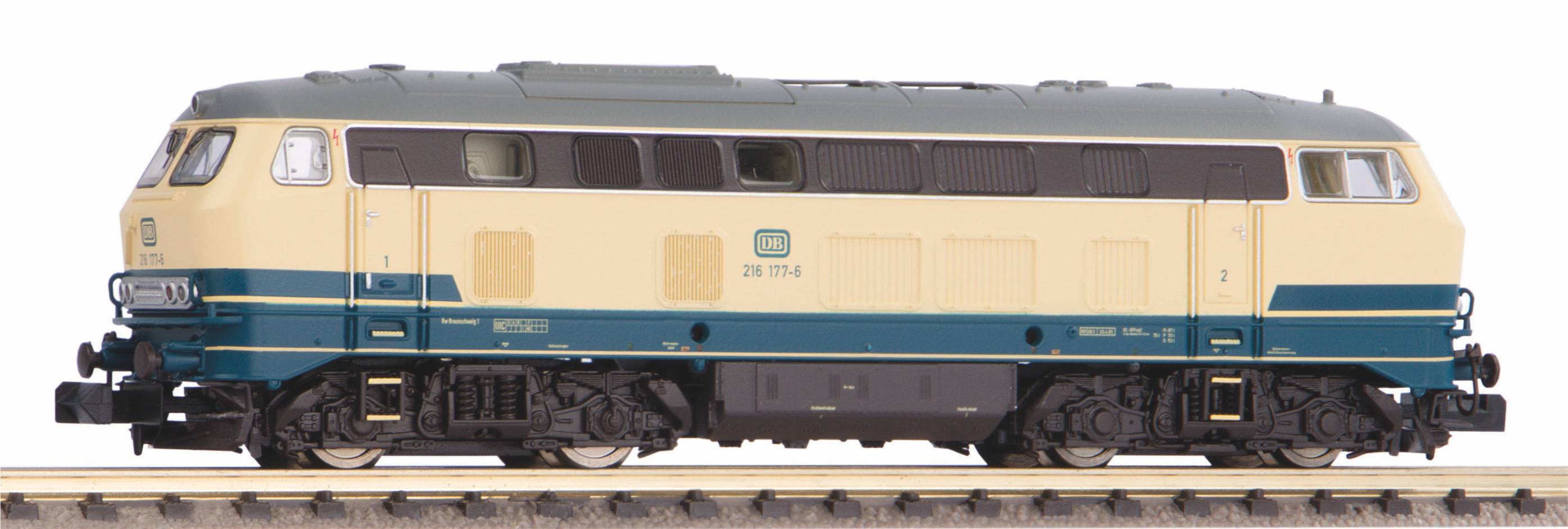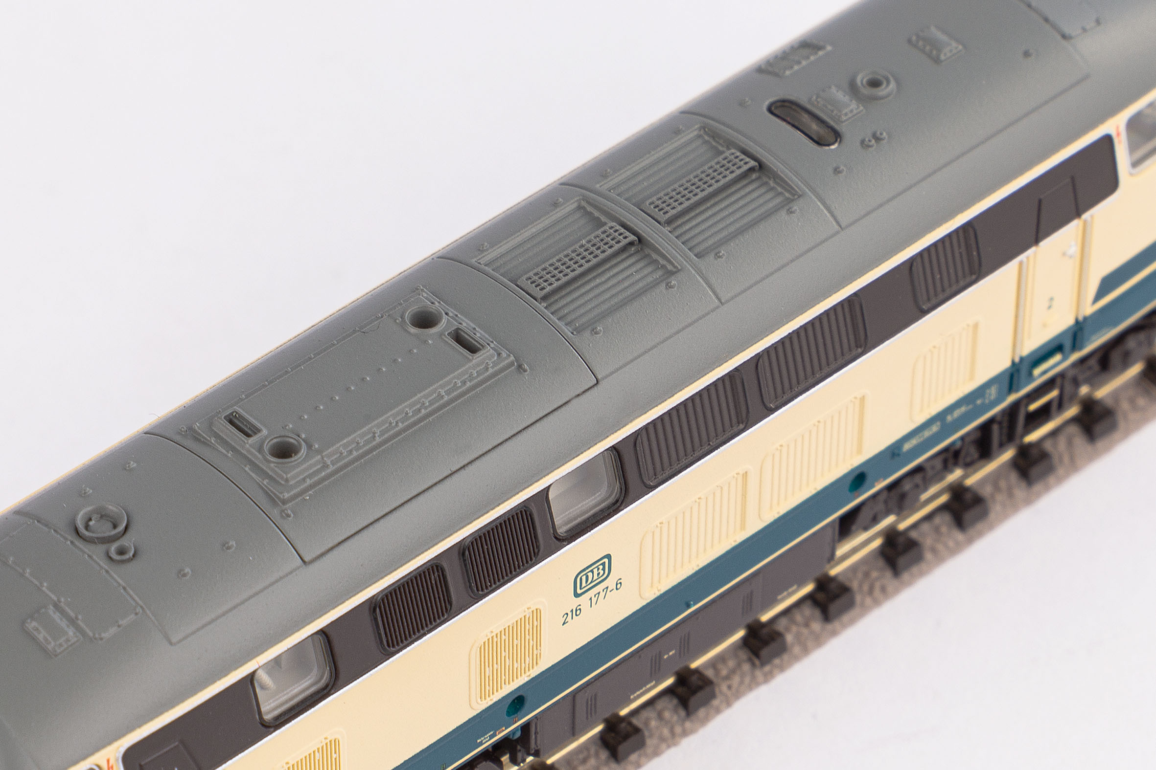 Variante der BR 216 der DB in beige-blauer Lackierung. Die Baureihe V 160 bzw. 216 war in den 1960er- und 1970er-Jahren bei der Bundesbahn die Eilzuglok für Strecken ohne Fahrdraht. Das Modell dieses wichtigen Fahrzeugtyps schließt nicht nur im N-Sortiment von PIKO eine Lücke, sondern wird durch zahlreiche Varianten viele Modellbahnanlagen der Epochen III bis V bereichern. Das Entwicklerteam hat die markante Formgebung des Vorbilds in herausragender Qualität im Modell umgesetzt und dabei gleichzeitig ideale Fahreigenschaften erzielt. Diese Attribute werden durch den wirkungsvollen Einsatz perfekter Gravuren und einer bis ins kleinste Detail stimmigen Lackierung unterstrichen. Zeitgemäße LED-Technik dient als Basis für den Lichtwechsel in Rot und Weiß. In der Soundvariante verfügt das Modell der BR 216 ab Werk über einen passenden Next18-SoundDecoder.
