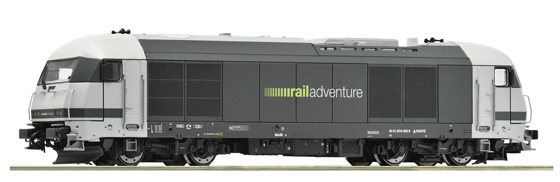 Diesellokomotive 2016 902 der Railadventure. - Beigelegte Außenspiegel für ein- und ausgeklappte Stellung - Extra angesetzte Griffstangen, Scheibenwischer und UIC-Dosen - Farblich abgesetzte Bremsscheiben - Im Digitalbetrieb mit schaltbarem Fernlicht und einzeln schaltbarem Spitzen- oder Schlusslicht Die RailAdventure GmbH, mit Sitz in München, ist Marktführer von Probe- und Überführungsfahrten von Schienenfahrzeugen im gesamten europäischen Raum. Das Unternehmen besitzt Lokomotiven, Kupplungsadapter- und Bremswagen. Neben diversen Elektrolokomotiven, hat RailAdventure auch eine dieselelektrische Lokomotive vom Typ Siemens EuroRunner, für nichtelektrifizierte Strecken mit geringen Achslasten, im Einsatz. Ende 2022 wurde die Lokomotive von der Steiermarkbahn gekauft und danach mit dem Design von RailAdventure versehen.