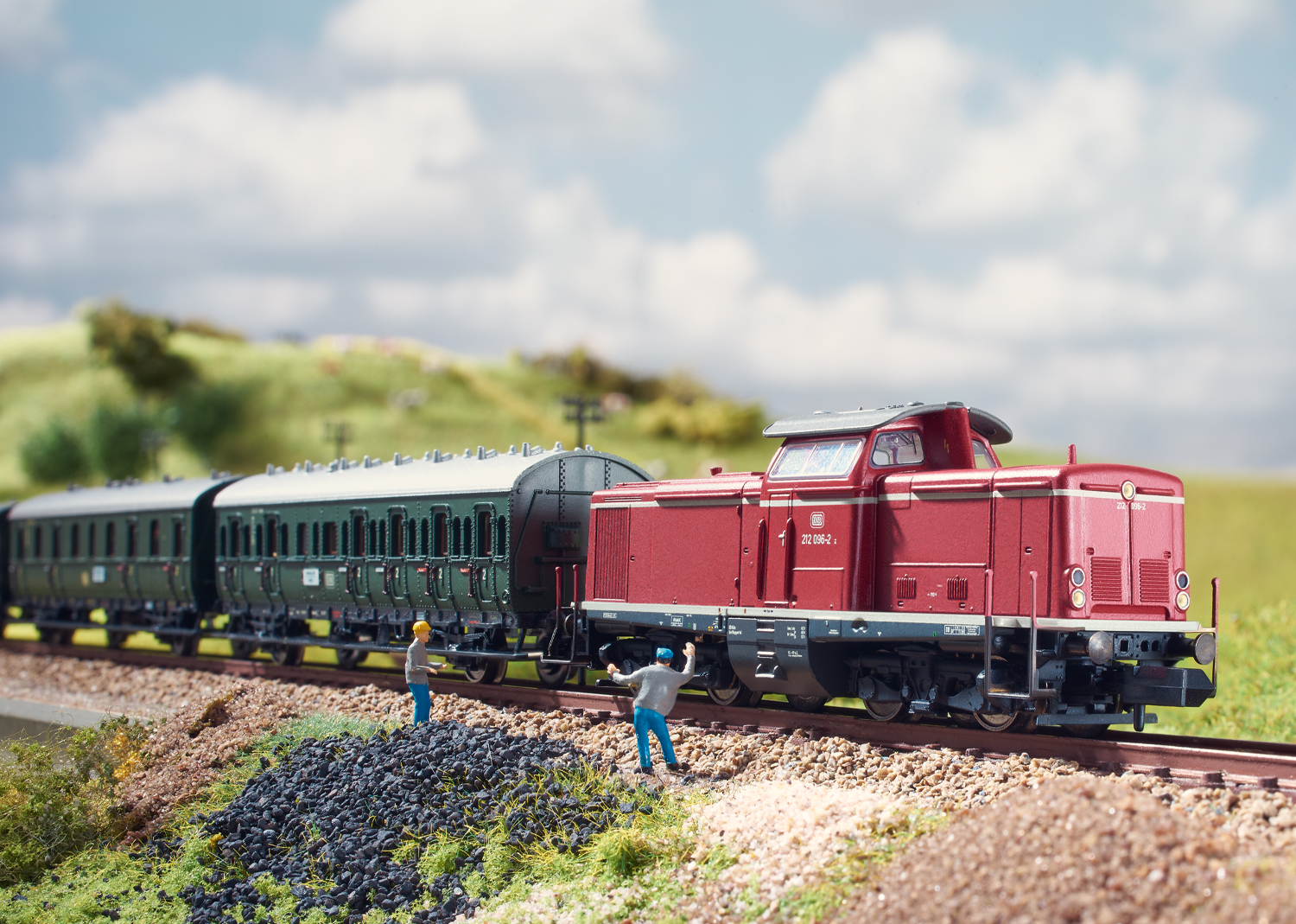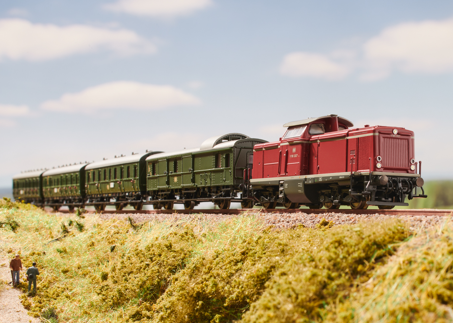 Diesellokomotive Baureihe V 100.20 - Imposant und absoluter Kult - unsere V 100Die V 100 in Profi-Ausführung und mit leichten Ruß-Alterungen auf dem DachVorbild: Diesellokomotive V 100 2027 der Deutschen Bundesbahn (DB). Ausführung in Purpurrot der Epoche III.Einsatz: Personen- und Güterzüge.Modell: Eingebauter Digital-Decoder und Geräuschgenerator zum Betrieb mit mfx und DCC. Motor mit Schwungmasse, 4 Achsen angetrieben, Haftreifen. Fahrtrichtungsabhängig wechselndes Dreilicht-Spitzensignal und 2 rote Schlusslichter, abschaltbar. Angesetzte Griffstangen. Länge über Puffer 75 mm.