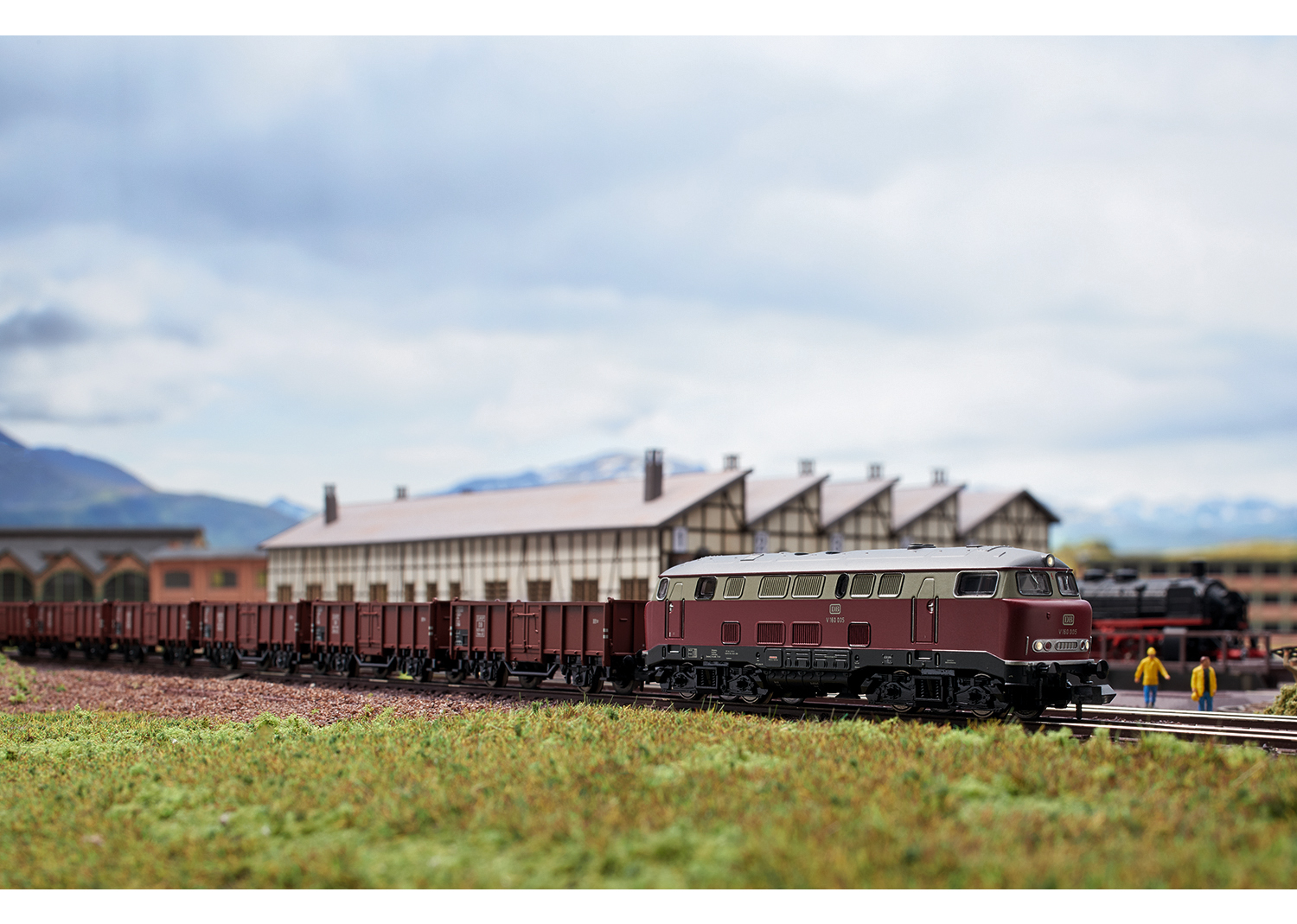 Diesellokomotive Baureihe V 160 - Modell: Mit Digital-Schnittstelle, 5-poliger Motor. 4 Achsen angetrieben, Haftreifen, Spitzensignal. Länge über Puffer 100 mm. Vorbild: Diesellokomotive V 160 003 Vorserie der Deutschen Bundesbahn. Spitzname Lollo. Achsfolge B'B', Baujahr ab 1960. Einsatz: Reise- und Güterzüge. 1956 vereinbarte das Bundesbahn-Zentralamt München mit der Lokomotivfabrik Krupp in Essen die Entwicklung einer einmotorigen Mehrzweck-Diesellokomotive. Geplant war ursprünglich eine Maschine mit einer Nennleistung von 1.600 PS und eine Baureihenbezeichnung entsprechend der damaligen Gepflogenheiten als V 160. Sie sollte zwei Führerstände, zwei zweiachsige Drehgestelle, eine Höchstgeschwindigkeit von 120 km/h, eine größte Länge über Puffer von rund 16.000 mm sowie ausreichende Zugheizung für einen D-Zug mit zehn Wagen besitzen. 1960/61 lieferte die Firma Krupp sechs Prototypen als V 160 001-006, die mit unterschiedlichen 1.900-PS-Motoren und Getrieben ausgerüstet waren. 1962/63 folgten vier weitere Maschinen (V 160 007-010) von Henschel. Die ersten neun Loks besaßen unterhalb der Stirnfenster einen wohlgerundeten Vorbau, der ihnen schnell den Spitznamen äLollo“ (nach der italienischen Filmschauspielerin Gina Lollobrigida) einbrachte. Die zehnte Lok hingegen zeigte das von der V 320 001 übernommene kantige, moderne Gesicht, das zum typischen Kennzeichen der ganzen V 160-Familie werden sollte. Die ab 1968 als 216 001-010 bezeichneten Vorserienloks wurden zwischen 1978 und 1984 ausgemustert. Erhalten blieben V 160 003 (DB-Museum), V 160 001, 004 und 006 (Italien) sowie die zwischenzeitlich wieder nach Deutschland zurückgeholte V 160 002. Nach einer umfangreichen Instandsetzung bis September 2015 ist sie heute in Deutschland als einzige äLollo“ betriebsfähig. Die restlichen Vorserienloks wurden verschrottet. Neue Betriebsnummer V 160 003 Spitzname Lollo Preisgünstiges Modell aus dem Hobby-Programm