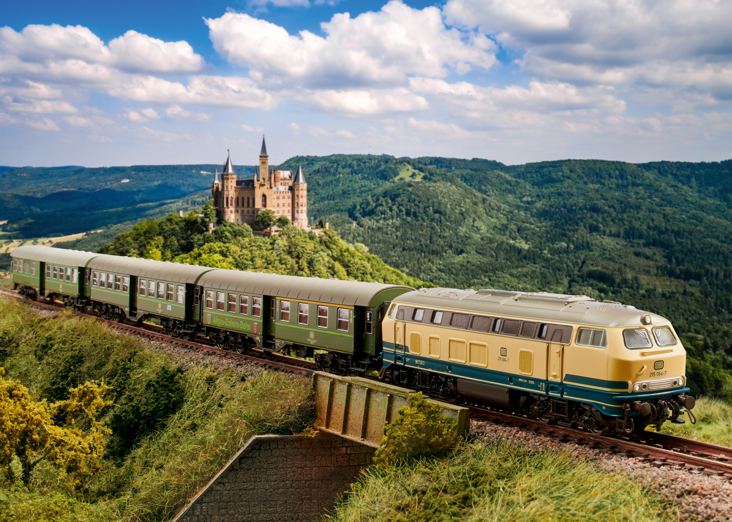 Diesellokomotive Baureihe 215 - Die DB in den Achtzigern: Die Allgäu-Zollern-BahnDie 1970er und 1980er Jahre sind eine bunte Epoche: bei der Deutschen Bundesbahn und natürlich auch auf der Minitrix-Modellbahn. Damals sollten neue Farben und ungewöhnliches Design frischen Wind auf die Schienen bringen – und das nicht nur im Fernverkehr. Im Süden schrieb die äAllgäu-Zollern-Bahn“ Eisenbahn- und Verkehrsgeschichte, die nun mit neuen Minitrix-Modellen auf der heimischen Anlage oder in der Vitrine wiederbelebt werden kann. Um 1976 wollte die DB die württembergische Allgäubahn Aulendorf – Kißlegg stilllegen und auch die Zollernbahn Tübingen – Sigmaringen (– Aulendorf) stand auf dem Prüfstand. Die beiden Regionen erkannten schnell den Wert ihrer Bahn und ersannen in Kooperation mit der DB ein Konzept, um die Strecken attraktiver zu gestalten. In Ermangelung neuer Fahrzeuge versah man bewährte, aber schon relativ betagte Umbau-Personenwagen (Bauart yg) mit grünen Streifen, einem großen Schriftzug äAllgäu-Zollern-Bahn“ und mit Wappen von Gemeinden und Städten an den beiden Strecken. Bespannt wurde diesen Züge überwiegend mit den Diesellokomotiven der Baureihe. Obwohl es keine große Komfortsteigerung gab, geriet die Verbindung wieder ins Bewusstsein der Bevölkerung, die Stilllegung wurde abgewendet.Vorbild: Strecken-Diesellokomotive 215 064-7 der Deutschen Bundesbahn (DB) im Zustand um 1985. Dieselhydraulische Lokomotive mit Heizdampferzeuger.Modell: Eingebauter Digital-Decoder und Geräuschgenerator zum Betrieb mit mfx und DCC. Motor mit Schwungmasse, 4 Achsen angetrieben, Haftreifen. Stirnbeleuchtung und Schlusslichter mit der Fahrtrichtung wechselnd, warmweißen Leuchtdioden, Führerstandsbeleuchtung, digital schaltbar. Kinematik für Kurzkupplung. Fahrtrichtungsabhängig wechselndes Spitzensignal analog in Betrieb. Angesetzte Griffstangen. Länge über Puffer 102 mm.