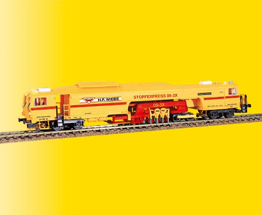 Schienen-Stopfexpress Fa. Wiebe. Funktionsmodell für Dreieitersysteme. Stopfexpress zur Schotteraufarbeitung von Plasser & Theurer. Voll funktionsfähiges Präzisionsmodell für den vorbildgerechten Einsatz im Eisenbahnbau. Mit elektrischem Antrieb, fahrtrichtungsabhängiger Dreilicht-Spitzenbeleuchtung bzw. roten Schlussleuchten, gelben Warnblinkleuchten sowie weißer Arbeitsraumbeleuchtung im Arbeitsbetrieb. Alle Beleuchtungen mit wartungsfreien LEDs. Das integrierte Soundmodul gibt verschiedene betriebsabhängige Geräusche und Pfeife wieder. RailCom-fähiger Digitaldecoder für DCC/MM und Analogbetrieb (DC/AC). Im Fahrmodus fährt der Zug wie eine gewöhnliche Lok dank seines leistungsstarken Kompaktantriebs seidenweich vorwärts bzw. rückwärts. Im Arbeitsmodus fährt der Zug mit Arbeitsgeschwindigkeit und laufender Stopfeinheit in Arbeitsrichtung. Funktionsumfang im Analogbetrieb: Fahrmodus vorwärts / rückwärts, Arbeitsmodus mit voll funktionsfähiger Stopfeinheit inkl. Beleuchtung (Warnblinkleuchten & Arbeitslicht) anwählbar, Sound aktiv (Lautstärke einstellbar im Analogbetrieb über Poti), Licht aktiv. Funktionsumfang im Digitalbetrieb: Fahrmodus vorwärts / rückwärts. schaltbare Funktionen: Arbeitsmodus (Schlitten- und Stopfbewegungen zusätzlich einzeln abrufbar), Warnblinkleuchten, Arbeitslicht, Sound (Lautstärke einstellbar im Digitalbetrieb über CV), Pfeife, Licht. Kupplungsschächte nach NEM 362 beidseitig, Kupplungsattrappen und mitgelieferter Systemkupplung. Maße: LüP 26,5 x B 3,3 x H 4,6 cm.