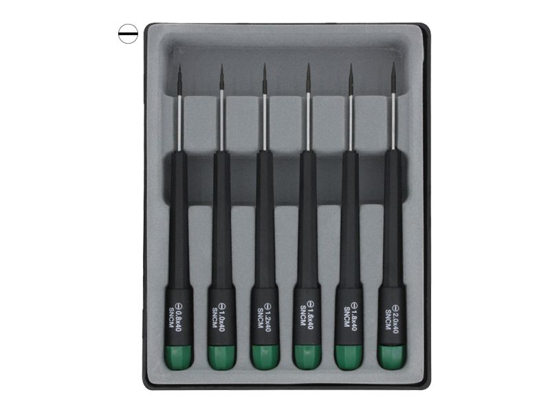 Schlitz Schraubendreher Uhrmacherschraubendreher Set 6-tlg. - Hochwertige Präzisions-Schraubendreher mit gehärteten Spitzen aus Nickel-Chrom-Molybdän-Stahl mit schwarzen Spitzen und farbig drehbarer Kuppe für schnelles und leichtes Drehen (Zwirbeln). Griffe aus Polyamid (PA6).- Schlitz 0,8 / 1,0 / 1,2 / 1,5 / 1,8 / 2,0 mm- Klingenlänge 40 mm