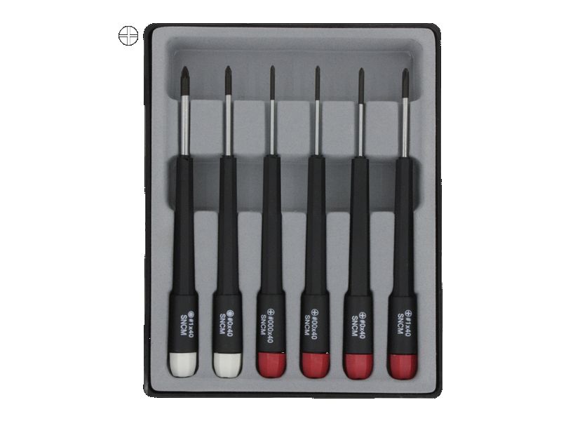 Kreuzschlitz Schraubendreher Uhrmacherschraubendreher Set 6-tlg. - Hochwertige Präzisions-Schraubendreher mit gehärteten Spitzen aus Nickel-Chrom-Molybdän-Stahl mit schwarzen Spitzen und farbig drehbarer Kuppe für schnelles und leichtes Drehen (Zwirbeln). Griffe aus Polyamid (PA6).- Kreuzschlitz Typ Philips 000 / 00 / 0 / 1 - Kreuzschlitz Typ Pozidrive 0 / 1- Klingenlänge 40 mm