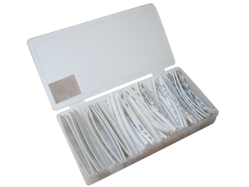 Schrumpfschlauch Sortiment Set 100 Teile 10cm weiß - Top ausgerüstet zum Top Preis! Dieses Sortiment sollte in keiner Werkstatt fehlen!Die dünnwandigen und flexiblen Schrumpfschläuche in der Farbe weiss sind in 10cm lange Stücke vorgeschnitten und werden in einer übersichtlichen Box geliefert.