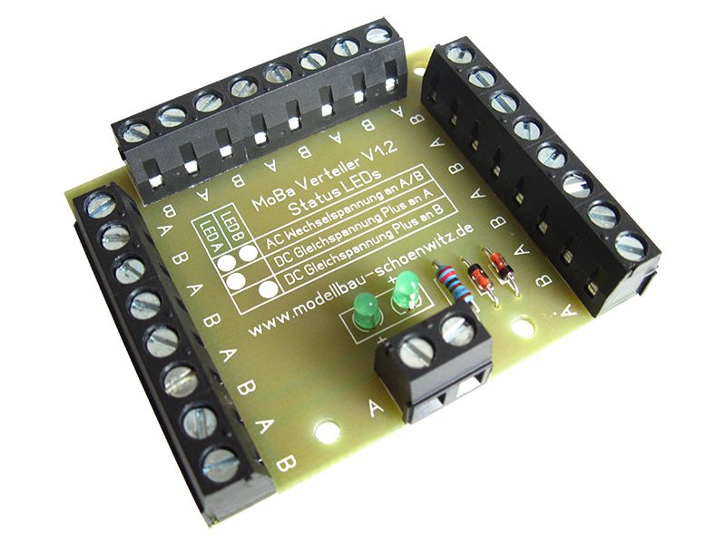 Stromverteiler MoBa Verteiler V1.2 Fertigbaustein - Dank des MoBa-Verteilers V1.2 ist es möglich, komfortabel unter der Modellbahnanlage zu verdrahten. Über die hochwertigen Schraubklemmen lassen sich schnell neue Verbraucher oder Gleisanschnitte mit Spannung versorgen. Alle mit A gekennzeichneten Klemmpunkte sind genau wie alle Punkte mit B durchverbunden. Neben jeder A Klemme liegt eine B Klemme. So können Sie Ihre Verbraucher übersichtlich ohne Kabelchaos anschließen.Durch die Status LEDs können Sie jederzeit unter der Anlage erkennen, ob an der Platine eine Spannung anliegt oder nicht, ganz ohne zu messen.Leuchten beide LEDs liegt eine Wechselspannung an A und B an.Leuchtet nur LED A, liegt eine Gleichspannung mit Plus an A und Minus an B an.Leuchtet nur LED B, liegt eine Gleichspannung mit Plus an B und Minus an A an.Sie erhalten eine fertig aufgebaute und geprüfte Platine, inklusive einer ausführlichen Anleitung.
