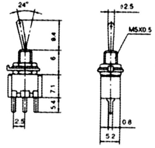 2 Stellungen - EIN / EIN ohne Mittelstellungmit BefestigungsmaterialGewinde ØxL - 5x6mm oder Printmontage3-polige Lötstifte - 0,8mmAbmessungen LxBxH - 24 x 5 x 8mm