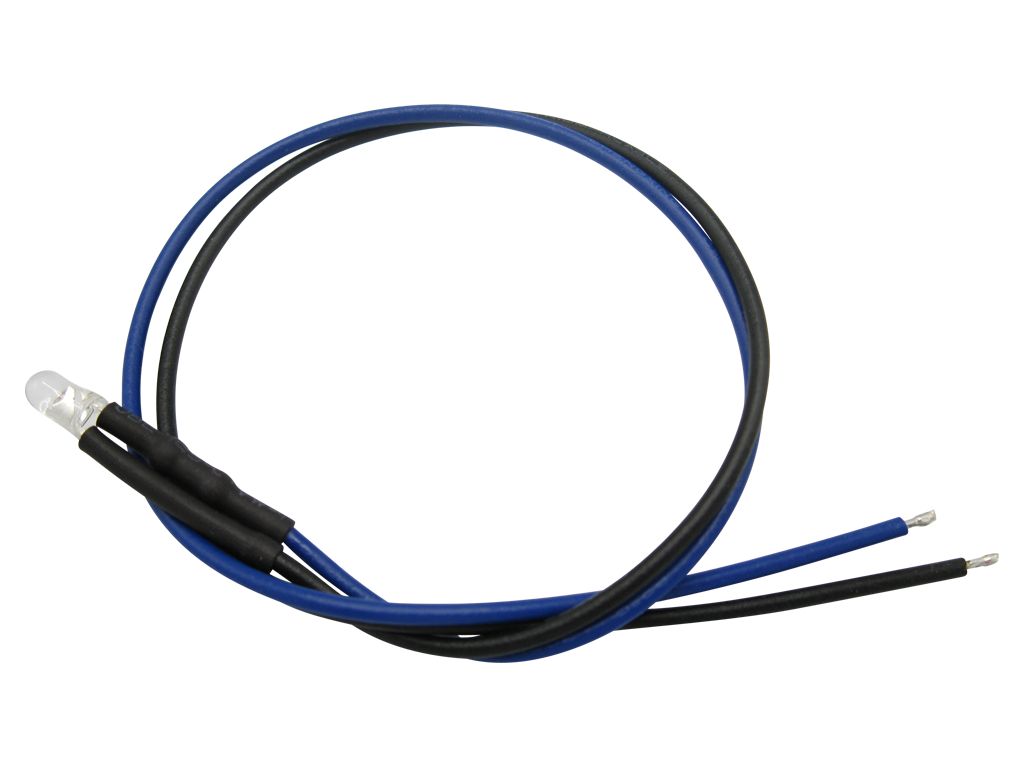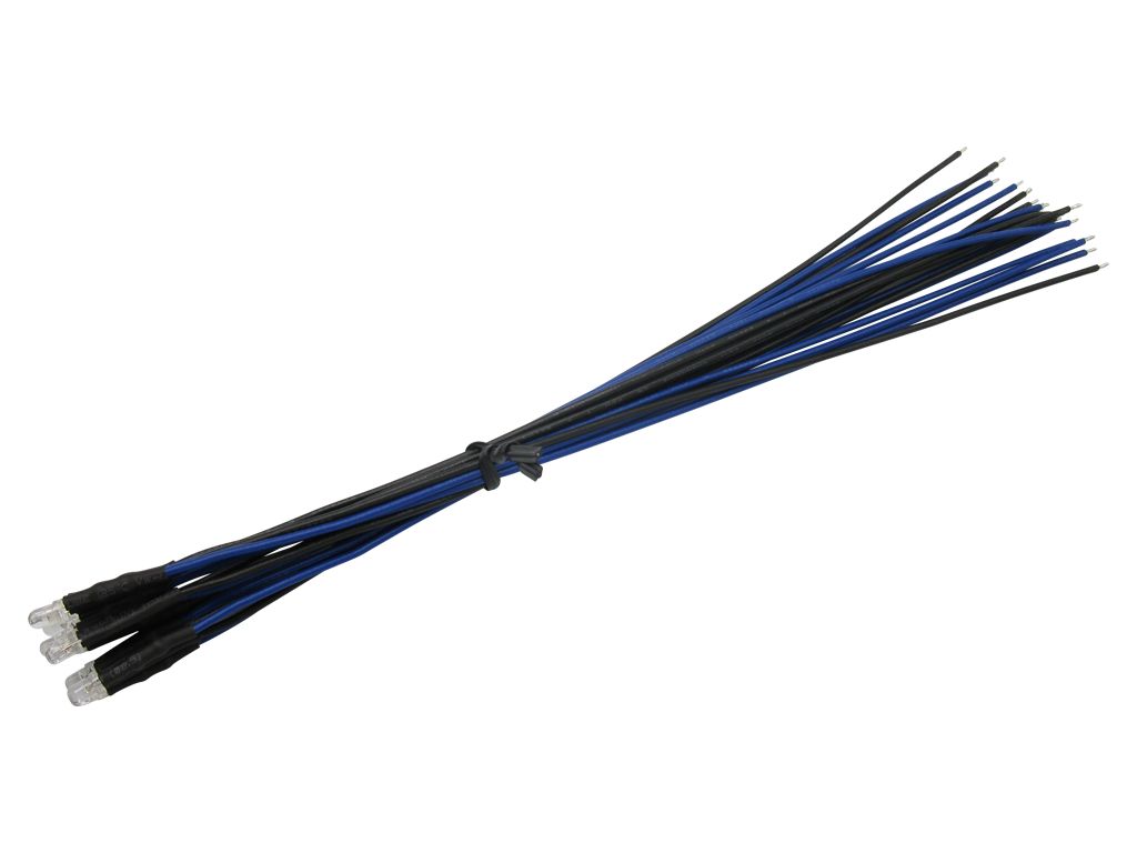 Beleuchtungsset mit 10 anschlussfertigen 3mm LEDs in der Leuchtfarbe blau. Von 12V bis 24V universell einsetzbar.
