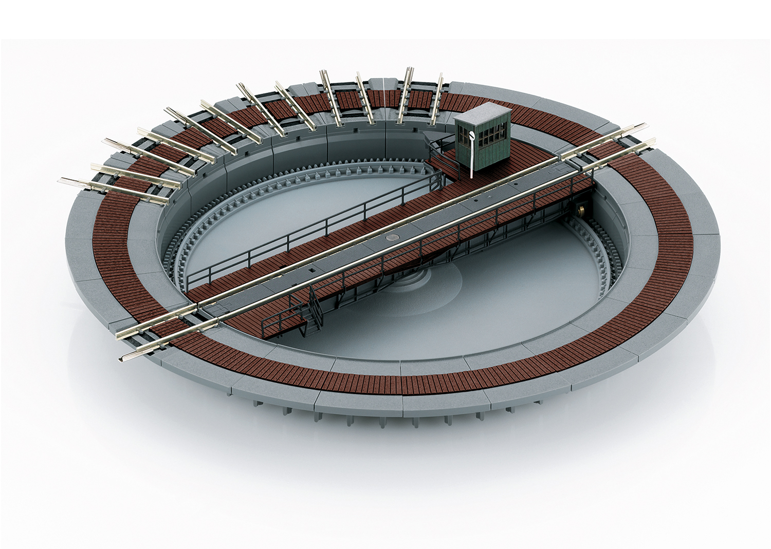 Das Modell ist zum versenkten Einbau in der Anlagengrundplatte vorgesehen. 8 Gleisanschlüsse am Rand. Auf bis zu 24 Gleisanschlüsse durch aufsteckbare Randsegmente 66571 erweiterbar. Reich detaillierte Einzelheiten und vorbildgetreue Farbgebung. Fernsteuerung der Drehbühne mit dazugehörigem und im Lieferumfang enthaltenen Steuergerät. Antrieb durch kräftigen Elektromotor. Automatische Abschaltung aller Gleise, die nicht mit der Drehbühne in Kontakt stehen. Außendurchmesser der Drehscheibe 170 mm. Durchmesser der Einbauöffnung in der Grundplatte 145 mm. Einbautiefe bei direktem Anschluss der Kabel ca. 30 mm, bei Nutzung von Steckern ca. 50 mm. Länge der Drehbühne 132 mm, d.h. es können Dampflokomotiven bis zu einem Radsatzstand inklusive Spurkranz (nicht "Länge über Puffer"!) von 130 mm gewendet werden (z.B. eine Baureihe 44).
