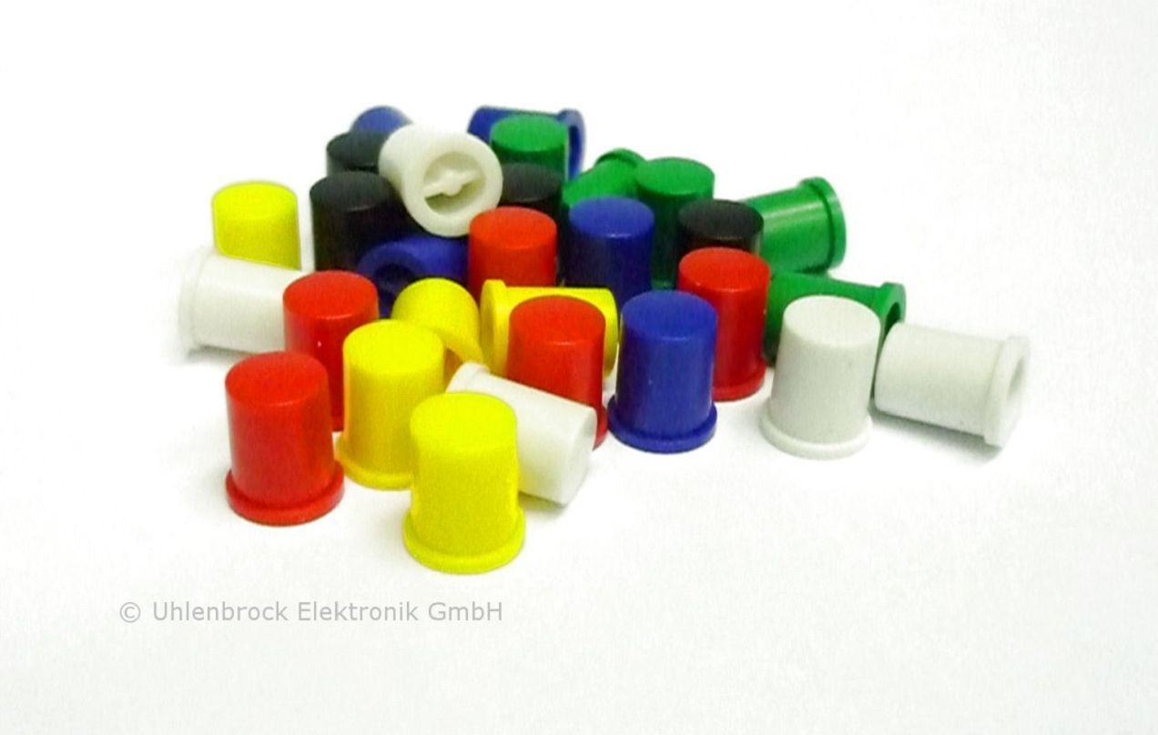 Je 5 Tastenkappen in den Farben blau, gelb, grün, rot, schwarz und weiß.
