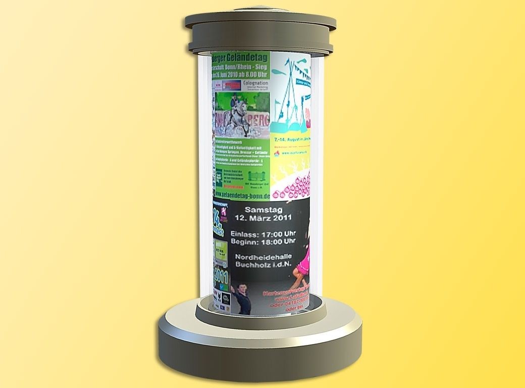 Vielseitig einsetzbar auf Gehwegen, in Parks, vor Bahnhöfen und auf Plätzen jeglicher Art. Die Plakate sind auswechselbar. Wartungsfrei dank LED-Beleuchtung. Mit Unterflur-Antrieb. Höhe 3,5 cm. Ø 2,1 cm. Einbautiefe: 50 mm.