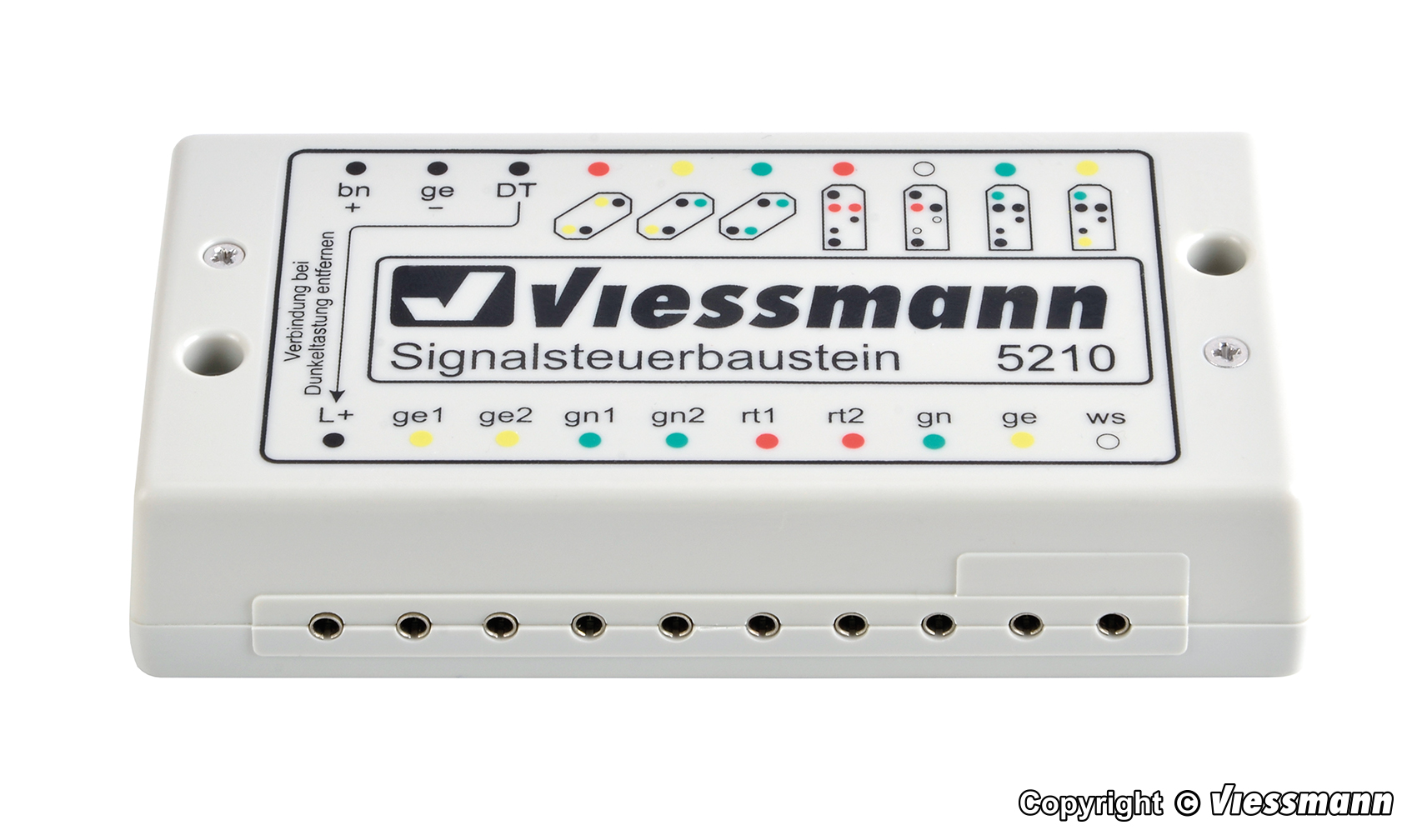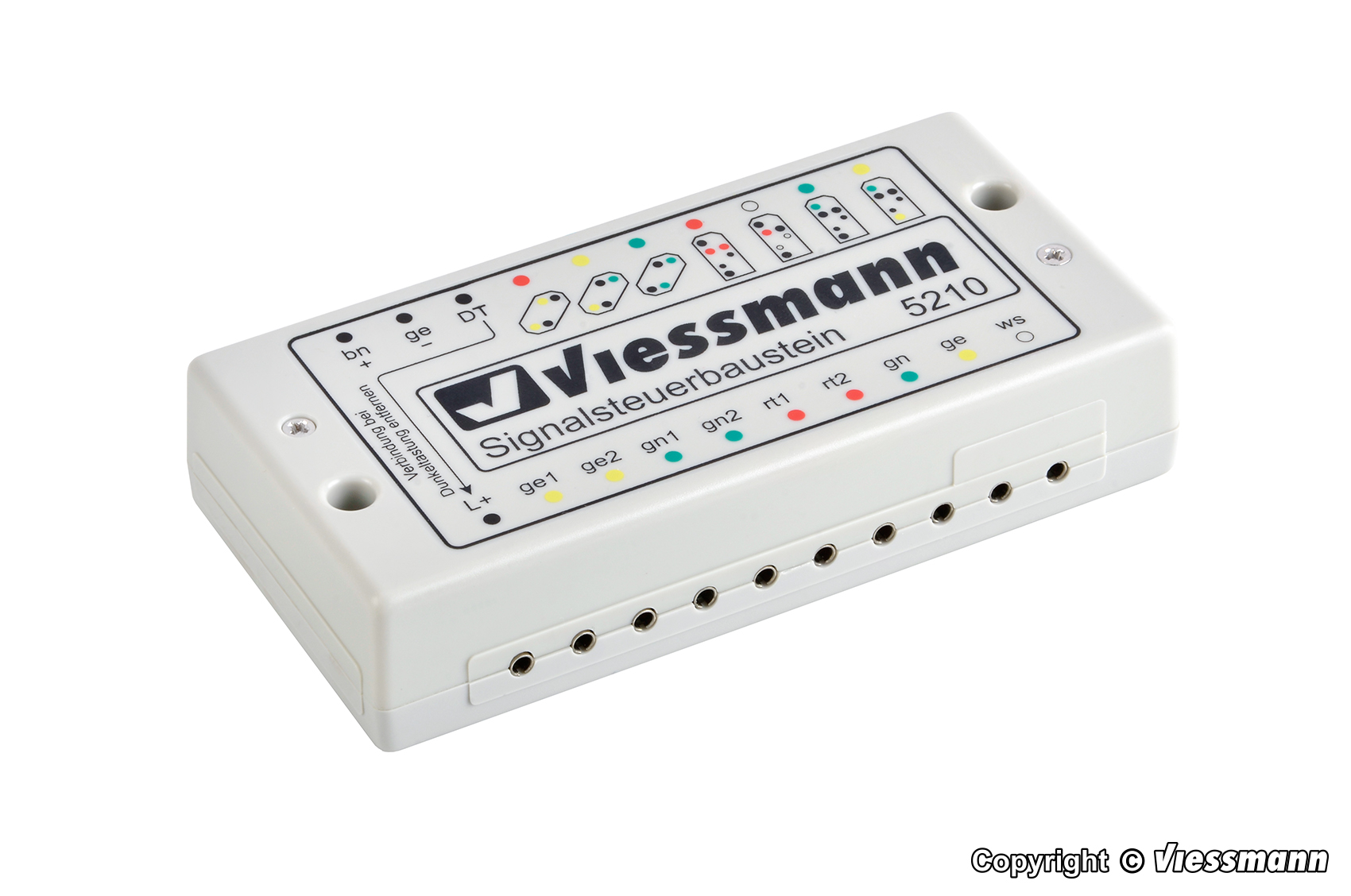 aller Baugrößen. Mit diesem Baustein können die für den vorbildgerechten Betrieb benötigten Lichtsignalbilder ohne Einsatz von Relais erzeugt werden. Wahlweiser Anschluss von einem mehrbegriffigen oder zwei 3-begriffigen Signalen. Durch besondere Technik erfolgt der Übergang zwischen den einzelnen Signalbildern wie beim Vorbild fließend, d. h., die LEDs glimmen nach. Wahlweise ist auch die Schaltung der Dunkeltastung (abgeschaltetes Vorsignal bei am gleichen Mast ?Halt?-zeigendem Hauptsignal) möglich. Ein Baustein ersetzt bis zu 7 Relais, die zur Ansteuerung der Signale in herkömmlicher Technik notwendig wären. Ohne Zugbeeinflussung, daher besonders für computergesteuerte Digitalanlagen geeignet. Ansteuerung über die Tasten-Stellpulte Art. 5546 oder 5547, Einzeltaster, Gleiskontakte oder Digitaldecoder möglich.