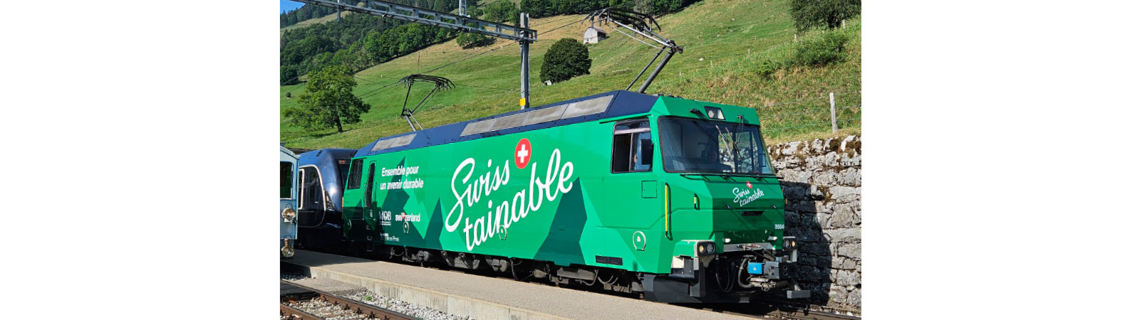 Bereits im letzten Sommer hat die MOB die Ge 4/4 8001 mit neuen Folien beklebt: sie wirbt mit dem Slogan ?Swisstainable? für Schweiz Tourismus. Damit stehen drei verschiedenfarbige Loks Ge 4/4 8001, 8002 und 8004 für den ?GoldenPass Express? (GPX) bereit.