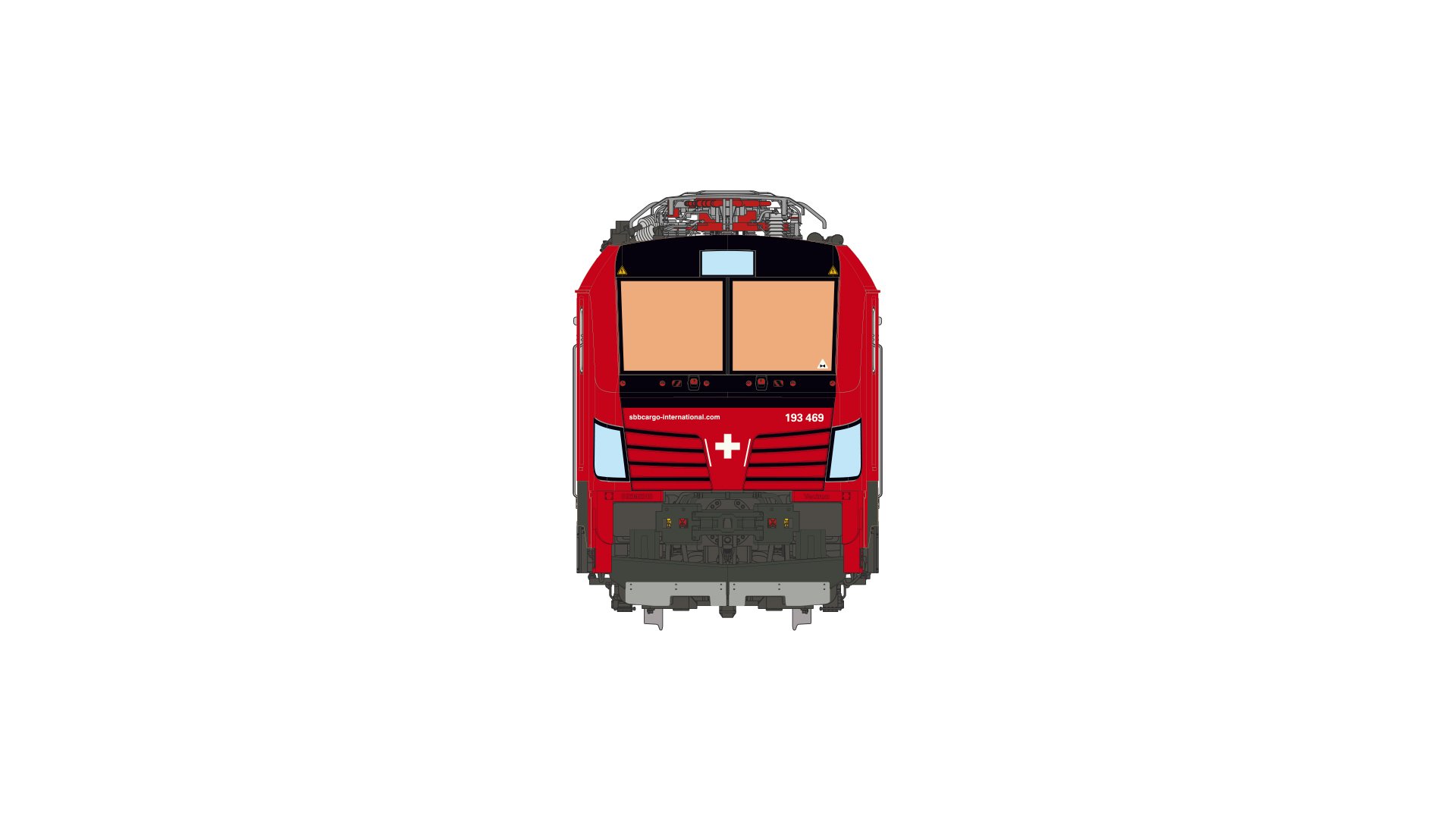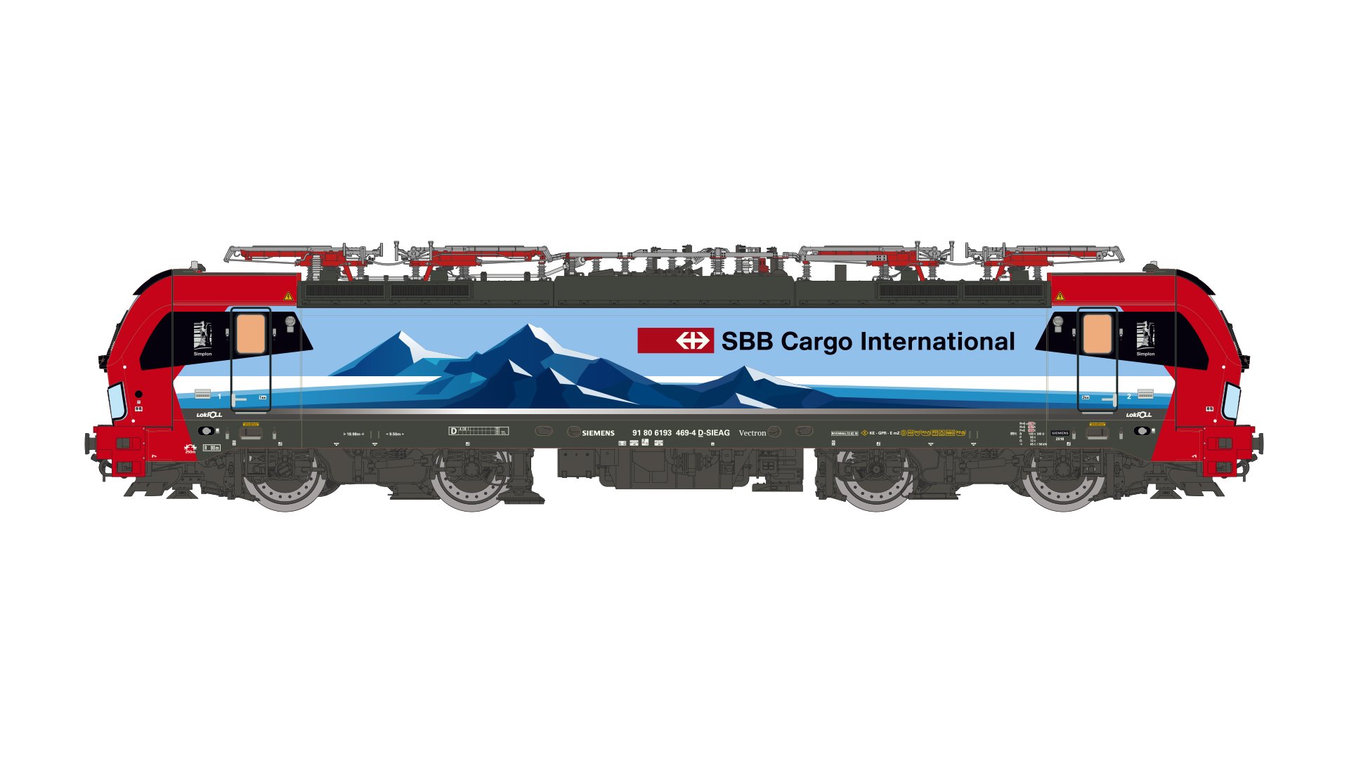 193 469 Alpenpiercer "Simplon", der SBB Cargo Zustand 2018, 4 Stromabnehmer, Zulassung D/A/CH/I, rotes Gehäuse, Alpenpanorama