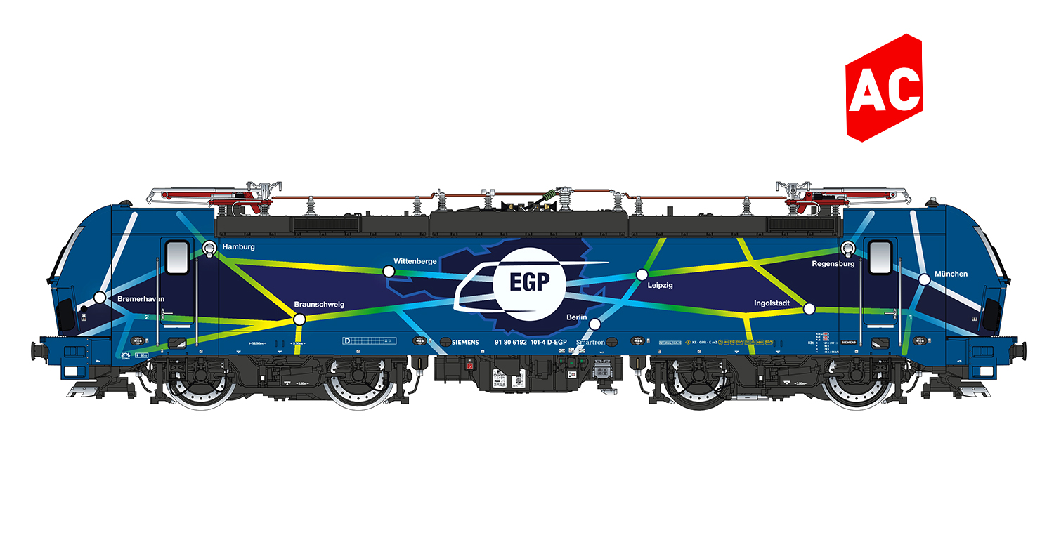 Fein detailliertes und sehr aufwendig bedrucktes Modell einer Elektrolokomotive der Baureihe 192 (Siemens Smarton). Antrieb durch einen kräftigen 5-pol Motor mit Schwungmasse auf alle vier Achsen, wovon eine mit Haftreifen ausgerüstet ist. Das LED Dreilicht-Spitzensignal und die rote Schlussbeleuchtung sind mit der Fahrtrichtung wechselnd. Die Modelle verfügen über eine 21-polige MTC Schnittstelle NEM 660
