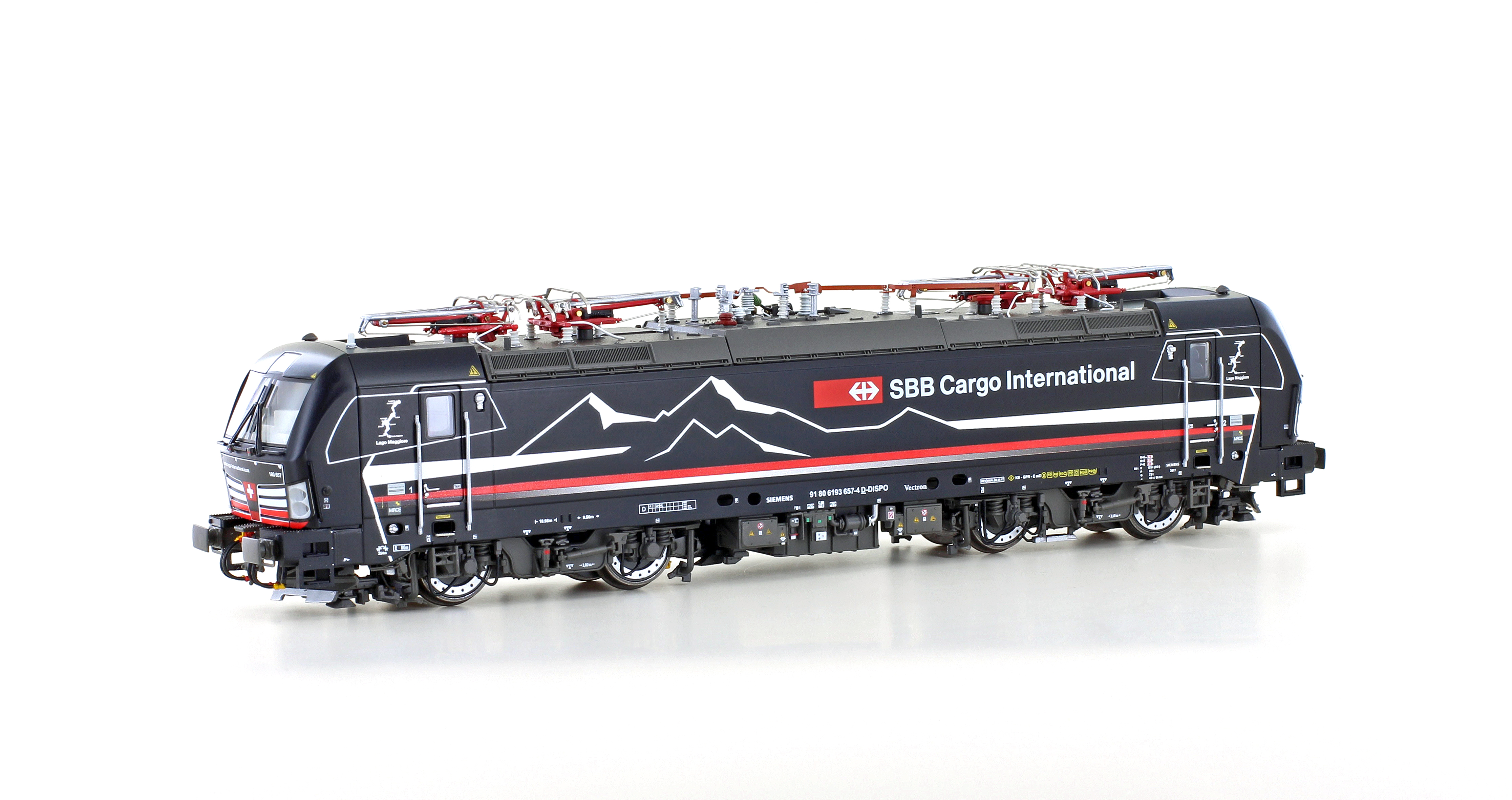 DCC Sound E-Lok Siemens Vectron MS der SBB Cargo International, schwarz im neuen schwarzen Shadowpiercer Design "Lago Maggiore", 4 Dachstromabnehmer, ausgerüstet für D/A/CH/I/NL, Betriebsnummer 193 657 D-DISPO, für die Epoche 6. Betriebszustand um 2022.