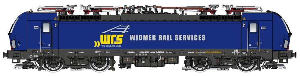 Widmer Rail Services ( WRS Wir bewegen Züge ), 4 Dachstromabnehmer, D/A/CH/I Betriebsnummer 91 80 6193 493-4 D-SIEAG für die Epoche 6.
