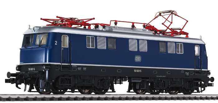 Elektrolokomotive Baureihe 110 der DB. Vorserienlok, Lok-Nr. 110 001-5. Modelldetails: Fahrgestell und Räder aus Metalldruckguss, Motor mit Schwungmasse, Haftreifen, digitale Schnittstelle (21-polig, nach NEM 660), vorbereitet für den Einbau von Sound-Decoder und Lautsprecher, Kurzkupplungskinematik, Liliput-Kurzkupplung, Kupplungsaufnahme nach NEM 362, Dreilicht-LED-Spitzensignal mit der Fahrtrichtung wechselnd, empfohlener Mindestradius 360 mm, LüP 185 mm.