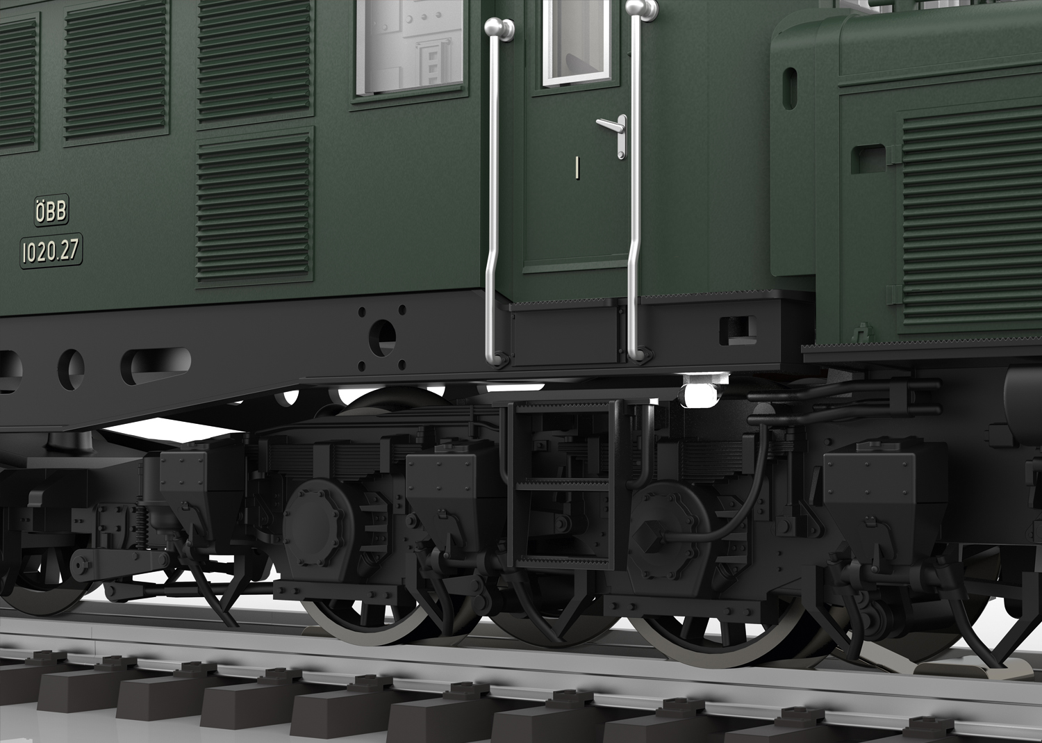 Elektrolokomotive Reihe 1020 - Modell: Mit Digital-Decoder mfx+ und umfangreichen Geräuschfunktionen. Geregelter Hochleistungsantrieb mit Schwungmasse, zentral eingebaut. Antrieb auf jeweils zwei Achsen je Treibgestell. Haftreifen. Fahrtrichtungsabhängig wechselndes Zweilicht-Spitzensignal und zwei rote Schlusslichter konventionell in Betrieb, digital schaltbar. Spitzensignal an Lokseite 2 und 1 jeweils digital separat abschaltbar. Wenn Spitzensignal an beiden Lokseiten abgeschaltet ist, dann beidseitige Funktion des Doppel-A-Lichtes. Führerstandsbeleuchtung jeweils separat digital schaltbar. Zusätzlich kann eine Anfahrlampe fahrtrichtungsabhängig digital geschaltet werden. Beleuchtung mit wartungsfreien warmweißen und roten Leuchtdioden (LED). Angesetzte Griffstangen. Führerstände und Maschinenraum mit Relief-Inneneinrichtung. Ansteckbare Bremsschläuche und Schraubenkupplungsimitationen liegen separat bei. Länge über Puffer 21,4 cm. Vorbild: Schwere Güterzug-Elektrolokomotive Reihe 1020 (ex BR E 94) der Österreichischen Bundesbahnen (ÖBB). Tannengrüne Grundfarbgebung. Lok-Betriebsnummer 1020.27. Betriebszustand um 1955. Ein passendes und zeitgenössisches Güterwagen-Set finden Sie im Märklin H0-Sortiment unter der Artikelnummer 46071. Dieses Modell finden Sie in Gleichstromausführung im Trix H0-Sortiment unter der Artikelnummer 25992. Besonders filigrane MetallausführungViele angesetzte DetailsAnfahrlampe digital schaltbarFührerstandsbeleuchtung digital schaltbarSpielewelt-Decoder mfx+ mit umfangreichen Betriebs- und Geräuschfunktionen