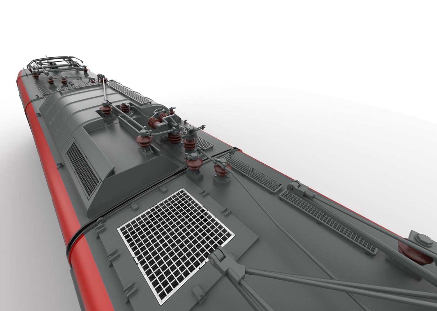 Modell: Komplette Neukonstruktion, Fahrgestell mit Hauptrahmen und Lokaufbau aus Zinkdruckguss. Viele angesetzte Messing-Schleudergussteile. Mit Digital-Decoder mfx mit bis zu 32 Funktionen, eingebauter Pufferkondensator parametrisierbar, geregeltem Hochleistungsantrieb und umfangreichen Geräuschfunktionen wie Fahrgeräusch, Lüfter, Lokpfiff, weitere Ansagen und Warnmeldungen. Betrieb mit Wechselstrom, Gleichstrom, Märklin Digital und DCC möglich. Hochleistungsmotoren mit Antrieb auf alle Achsen. Strompuffer parametrisierbar. Im Digitalbetrieb motorisch heb- und senkbare Dachstromabnehmer. Weiß/rotes Led-Spitzensignal im Wechsel der Fahrtrichtung, konventionell in Betrieb, digital schaltbar. Maschinenraumbeleuchtung schaltbar, LED-Beleuchtung in den Führerständen ebenso wie Anfahrlampe fahrtrichtungsabhängig.