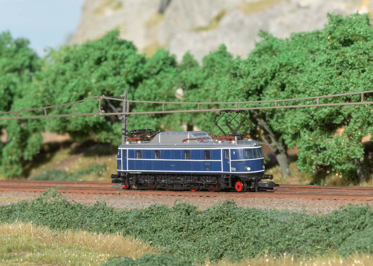 Modell: Ausgerüstet mit Glockenankermotor. Elektrische Oberleitungsfunktion. Feine Farbgebung und Beschriftung. Alle Treibachsen angetrieben. 3-Licht-Spitzensignal mit der Fahrtrichtung wechselnd. Spitzenbeleuchtung mit wartungsfreien, warmweissen LEDs. Länge über Puffer ca. 76 mm. Verpackt in einer edlen Echtholzbox. Vorbild: Museumslokomotive E 19 in kobaltblauer Grundfarbgebung im Zustand der Epoche IVb um 1977. E 19 – ein wahrlich klangvoller Name aus der ruhmreichen Geschichte der Deutschen Eisenbahn. Diese Bezeichnung steht für die einstmals leistungsfähigste Einrahmenlokomotive der Welt. Vier Exemplare dieser Baureihe ließ die Deutsche Reichsbahn kurz vor dem Zweiten Weltkrieg bauen. Die eleganten und formschönen Loks glänzten mit Superlativen: Höchstgeschwindigkeit 180 km/h (konstruktiv für 225 km/h ausgelegt), rund 5400 PS Stundenleistung und eine Anfahrzugkraft von über 200 Kilonewton (die schnelle Dampflokreihe 05 brachte es auf 110 bzw. 137 Kilonewton). Die E 19 sollte eine neue Epoche auf der elektrifizierten Magistrale Berlin – Frankenwald – Halle – Berlin einläuten. Obwohl sich die vier Probeloks sehr gut bewährten, unterblieb wegen des Kriegs ein Serienbau. Die Deutschen hatten andere Sorgen als in superschnellen Zügen durch die Lande zu rauschen.Alle vier E 19 kamen nach Kriegsende zur Bundesbahn, die die Höchstgeschwindigkeit auf 140 km/h beschränkte und die einstigen Starloks in Nürnberg und Hagen in normalen Schnell-, Eil- und sogar Personenzugdiensten einsetzte. Zwischen 1975 und 1978 schieden sie mit einer Gesamtlaufleistung von teilweise rund 4 Millionen Kilometern aus dem Betriebsdienst aus. E 19 12 wurde bereits 1977 vom AW München-Freimann restauriert und in den frühen blauen Bundesbahnzustand (Epoche IIIa) zurückversetzt. Erst nach dem Jubiläum 150 Jahre Deutsche Eisenbahn (1985) erhielt sie die rote Ursprungslackierung. Heute gehört E 19 12 zum DB-Museum Standort Koblenz. E 19 01 kann – ebenfalls in Rot - im Technikmuseum Berlin bewundert werden. Die beiden anderen äEdelhirsche“ E 19 02 und 11 wurden dagegen nach der Ausmusterung verschrottet.