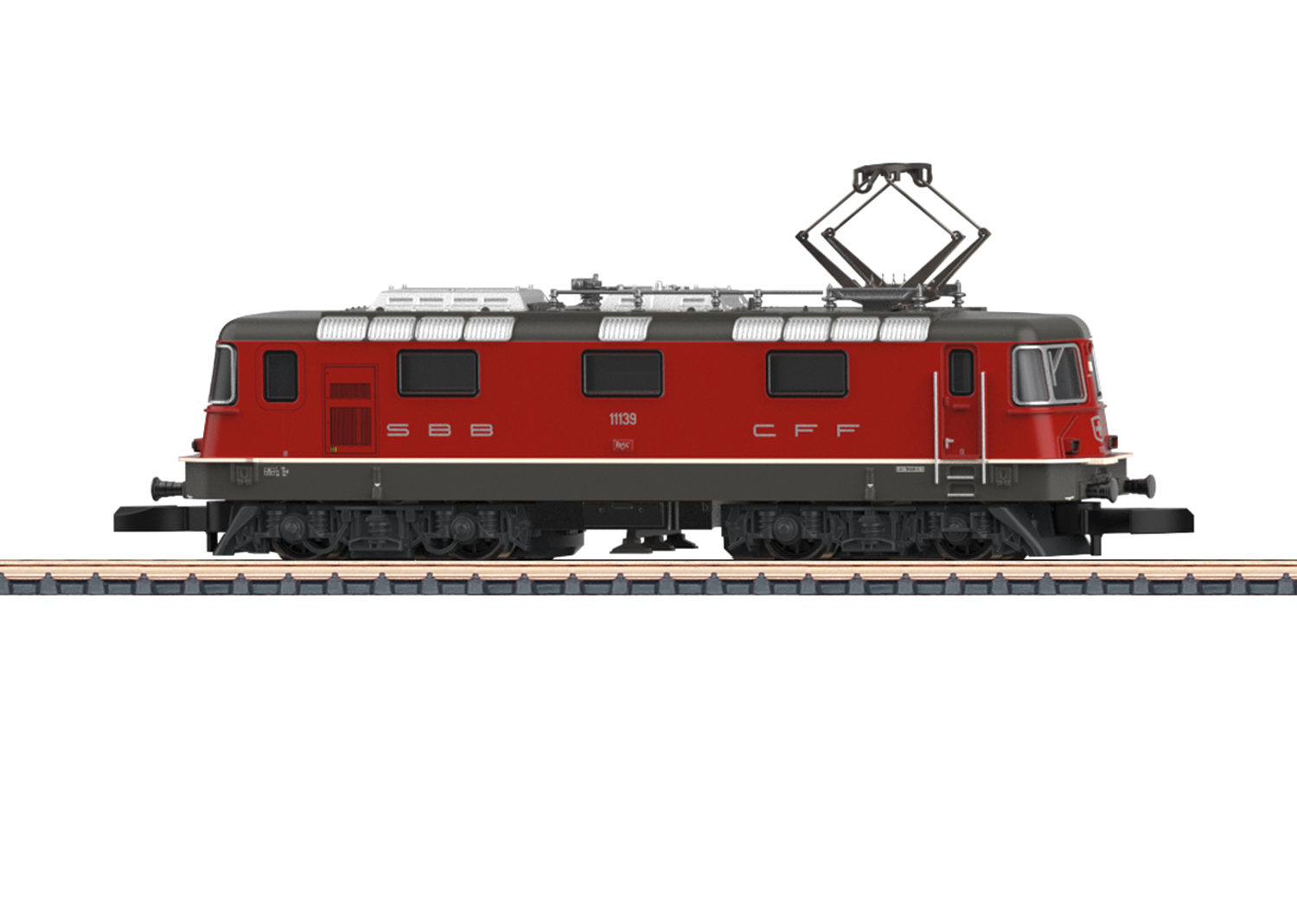 Elektrolokomotive Re 4/4 II - Vorbild: Elektrolokomotive Re 4/4 II der Schweizerischen Bundesbahnen (SBB) mit einem Stromabnehmer, im aktuellen Betriebszustand.Modell: Teilweise Neukonstruktion der Version mit einem Stromabnehmer und anderer Dachausrüstung. Lokomotive mit Glockenankermotor ausgerüstet, alle Achsen angetrieben. Beleuchtung mit wartungsfreien warmweißen Leuchtdioden (3 x weiß vorn, 1 x weiß rechts hinten – Schweizer Lichtwechsel). Bewegliche Schienenräumer an beiden Drehgestellen. Stromabnahme umschaltbar von Ober- auf Unterleitung. Länge über Puffer 75 mm.