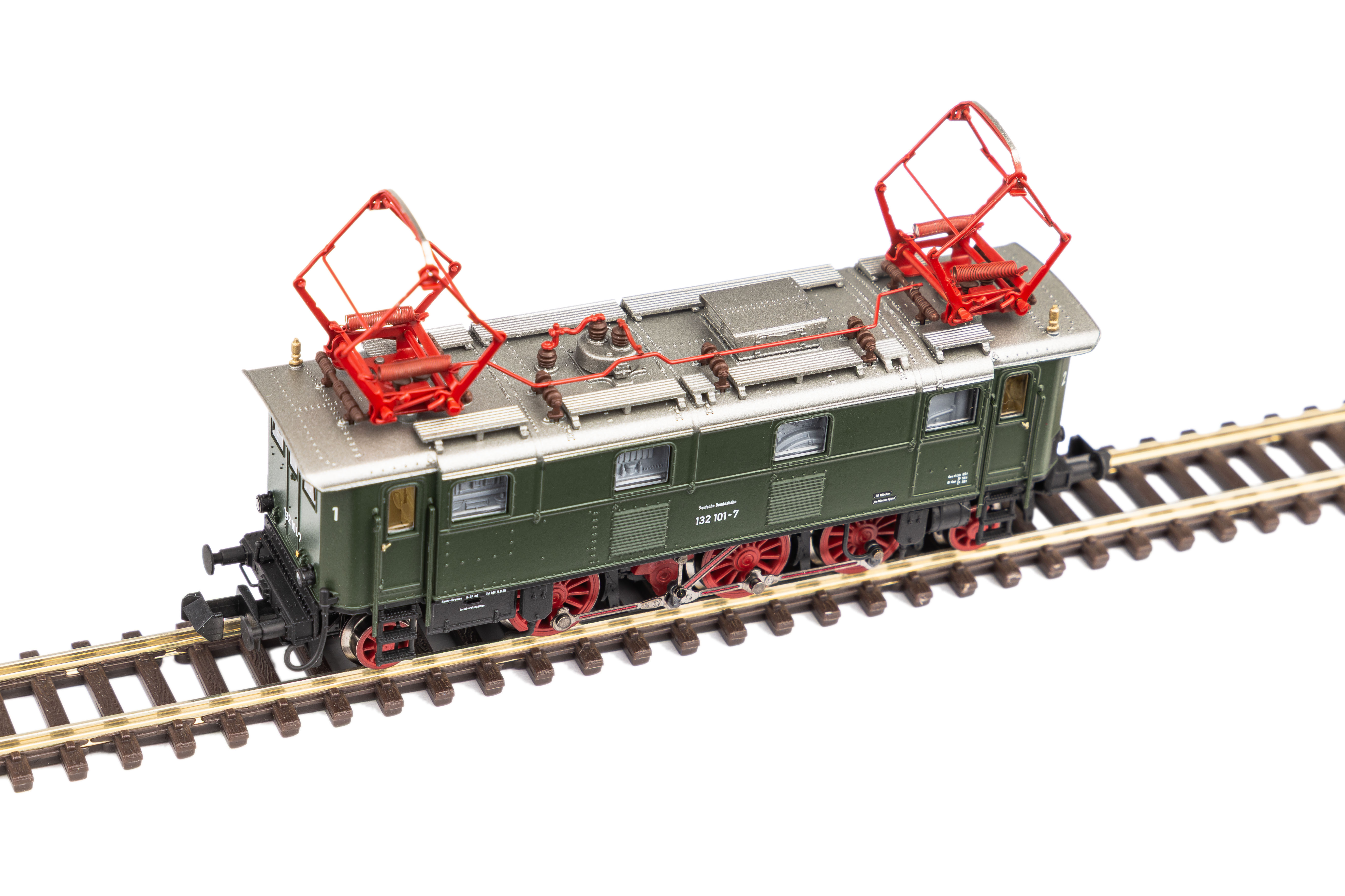 Neuheit 2025: Elektrolokomotive BR 132 der DB in Epoche IV in der Ausführung mit Reihenisolatoren und DB Einheitslampen. PIKO präsentiert dieses Stück Eisenbahngeschichte nun als formvollendetes Modell im Maßstab 1:160. Besonderheiten sind die fein zu erkennenden Detaillierungen, wie die Nietungen am Dach und angesetzte Sandkästen, Bremsschläuche sowie Handstangen. Zeitgenössische Lampen und die filigranen Scherenstromabnehmer runden das Modell optisch ab. Technisch weiß die Lokomotive mit einem serienmäßig eingebauten Lichtwechsel in LED-Technik mit roter Schlussbeleuchtung zu begeistern. Zu einfachen Nachrüstung eines Digitaldecoders verfügt das Modell über eine Next18-Schnittstelle.