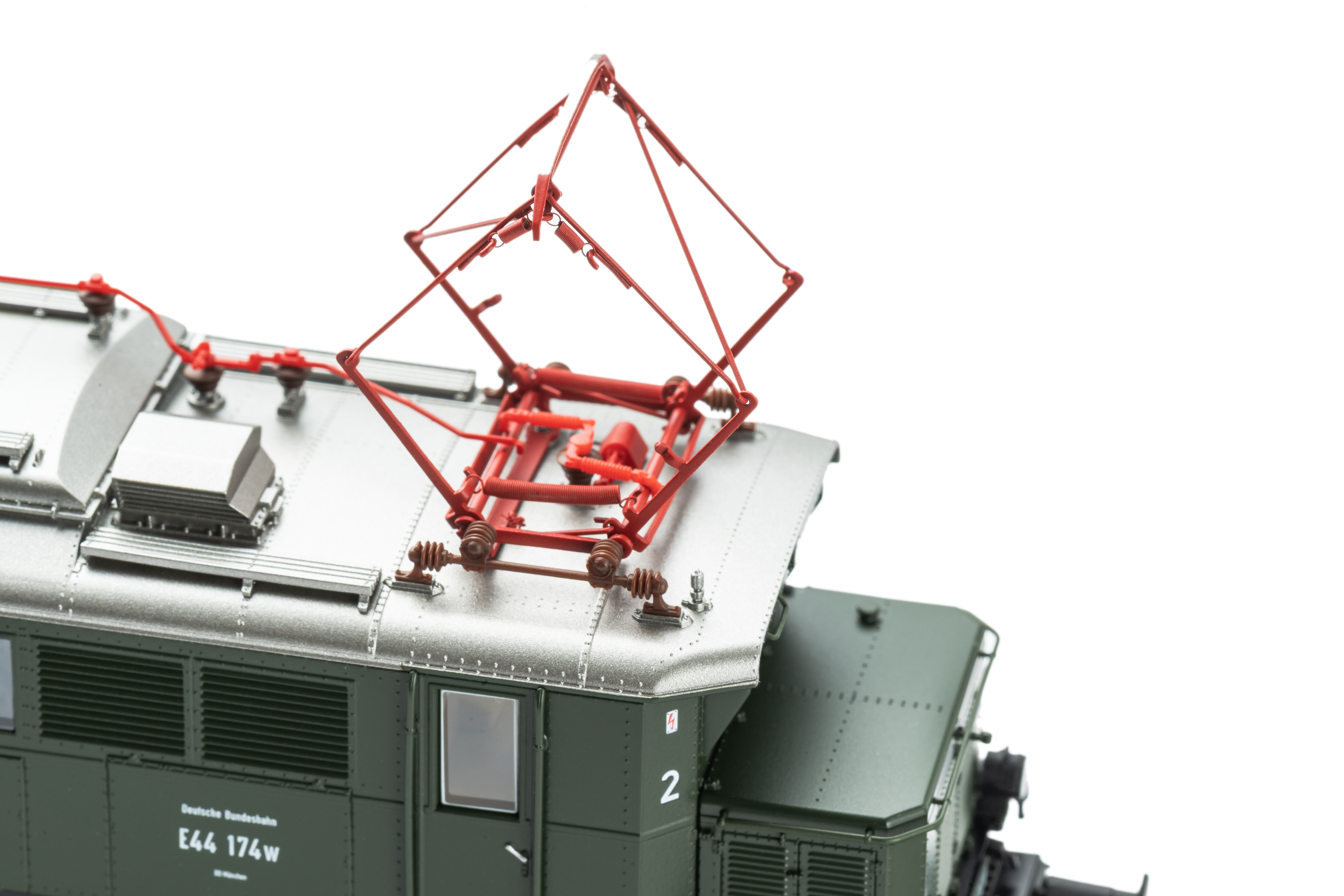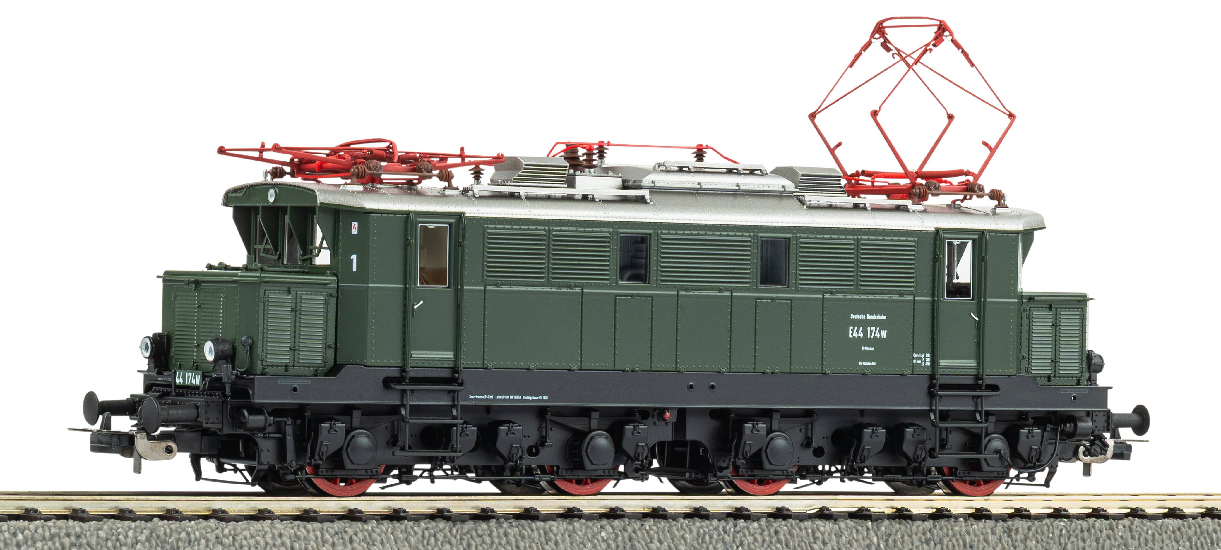 Neuheit 2025: Elektrolokomotive E 44 der DB in Epoche III in der Ausführung mit Widerstandsbremse. Die Miniaturen der Vor-, wie auch der Serienloks der späteren Baureihe 144 brillieren durch ihre exakt maßstäbliche Umsetzung. Gleichermaßen scharfe wie präzise Gravuren am Gehäuse sorgen für enorme plastische Tiefe und unterstreichen den exzellenten Gesamteindruck. Dies setzt sich auch im Fahrwerksbereich mit zahlreichen extra angesetzten Teilen an den markanten Drehgestellen fort. Identisch in der Modellqualität, wurden dennoch die Unterschiede zwischen den Vorbildlokomotiven in größtmöglicher Detailtiefe im Modell umgesetzt. Auch technisch lässt das Modell kaum Wünsche offen: Der Antrieb ist gleichermaßen bewährt wie robust, eine PluX22-Schnittstelle ermöglicht die kinderleichte Nachrüstung eines PIKO Digital-Decoders. In dieser Konstellation ist beispielsweise das Schalten von Maschinenraum- und Führerstandsbeleuchtung möglich.