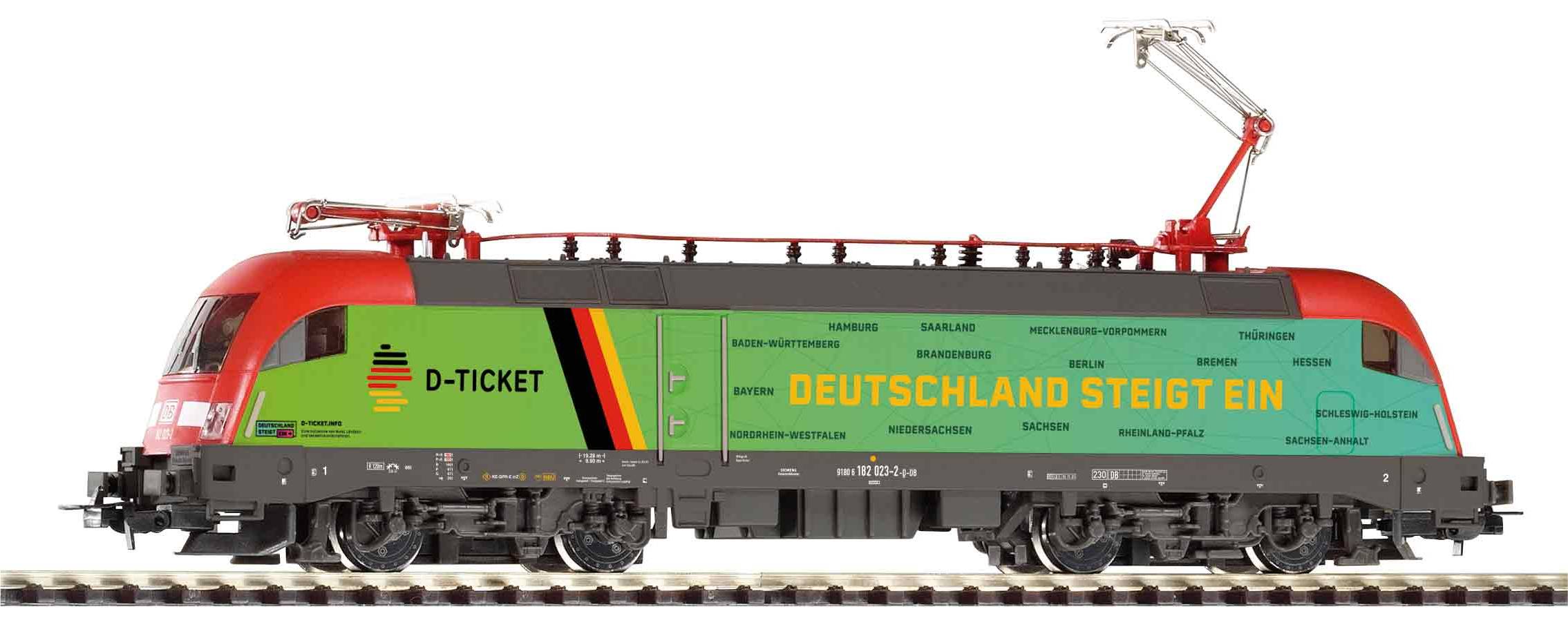 Neuheit 2024: Druckvariante der Elektrolok Taurus im Design der Kampagne "Deutschland steigt ein" zum Deutschlandticket. Das Modell verfügt über feingliedrige Metallstromabnehmer und besitzt eine Digitalschnittstelle nach NEM 652.