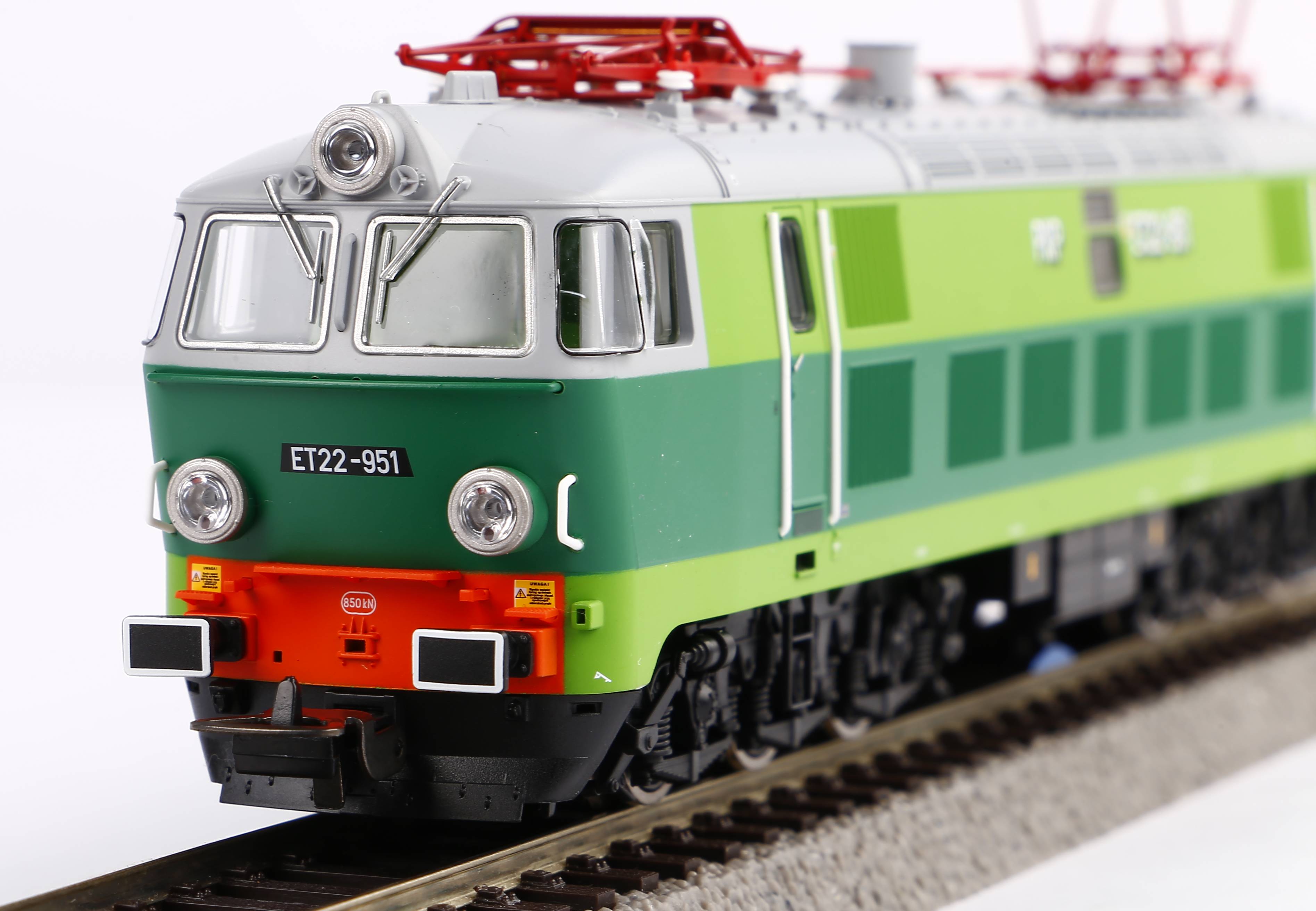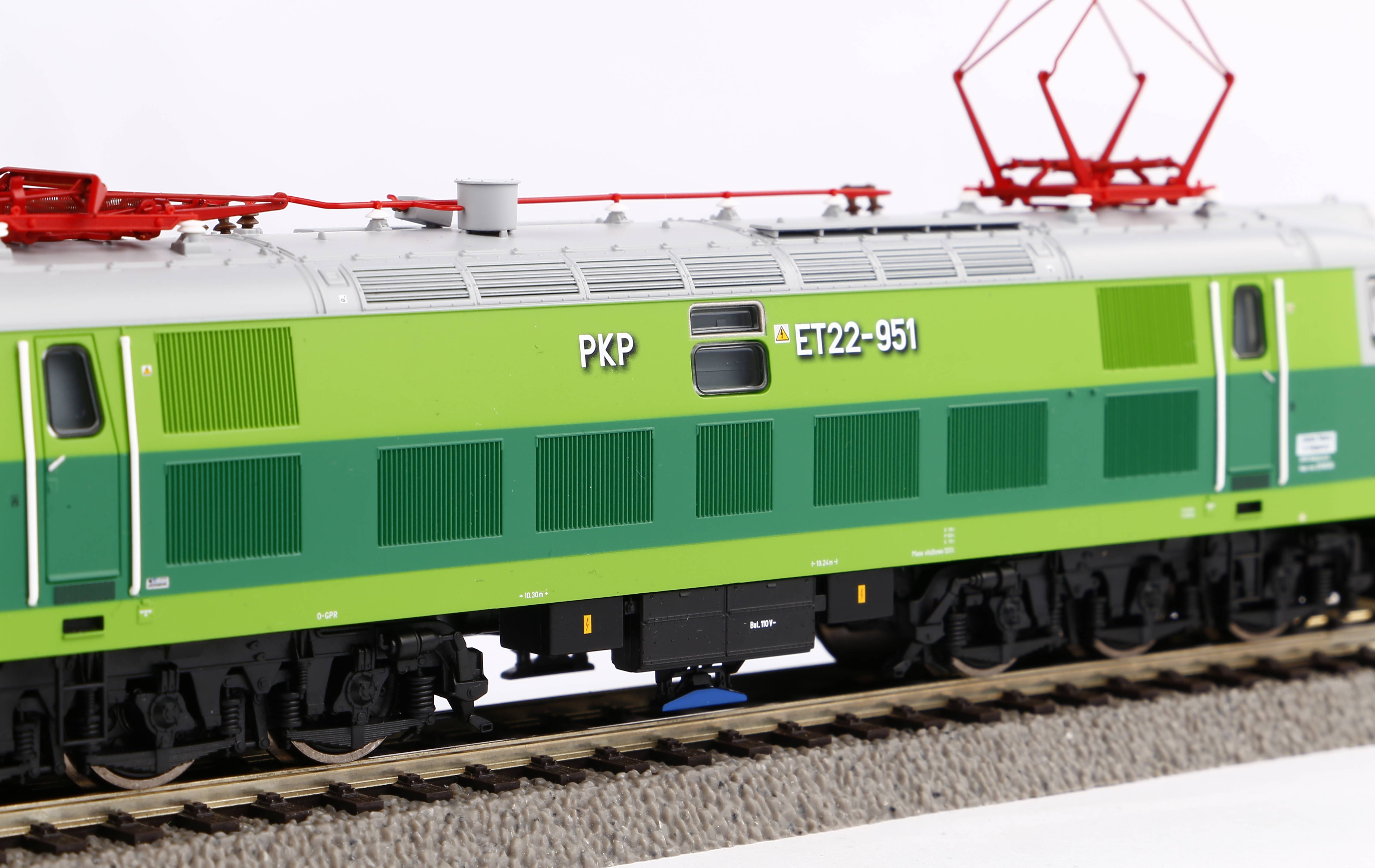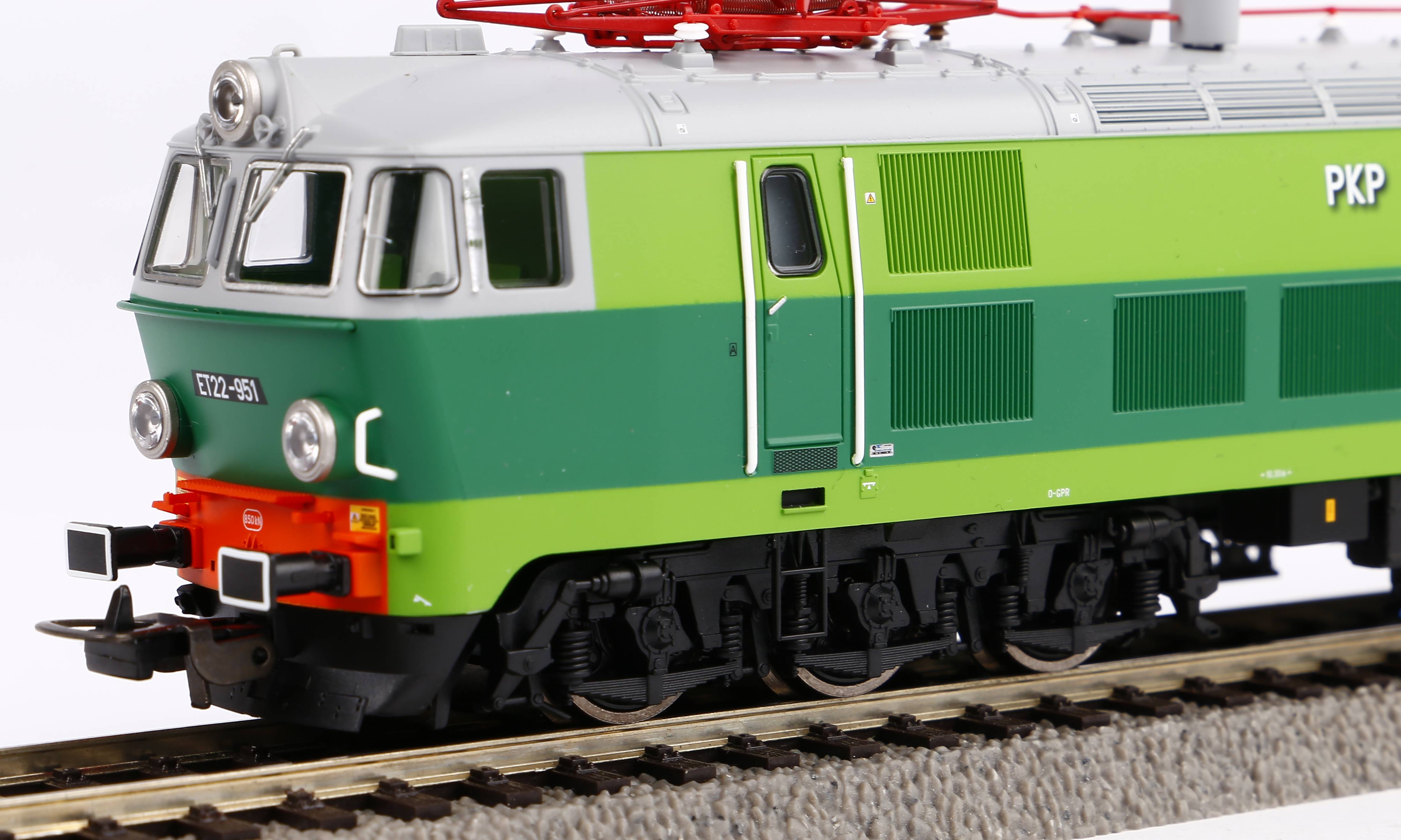 Druckvariante der ET22 PKP im Design der Epoche V. Die PIKO ET22 besitzt als Highlights feinste Lackierung und Bedruckung, filigrane Stromabnehmer, exakt umgesetzte Lampenbereiche, digital schaltbare Führerstandsbeleuchtungen und fahrtrichtungsabhängig funktionierende Front- und Schlusslichter. Die Beleuchtung erfolgt mittels LEDs. Das mit einem Zinkdruckgussrahmen versehene Modell verfügt über einen fünfpoligen Motor mit Schwungmassen für hervorragende Fahreigenschaften und zwei Haftreifen für hohe Zugkräfte, die auf den innenliegenden Achsen beider Drehgestelle diagonal angeordnet sind. Die einfache Nachrüstung von Sound und größtmöglichem Lautsprecher ist auf der aufgeräumt konstruierten Platine mit PluX22-Schnittstelle selbstverständlich vorbereitet. Ansteckbare Bremsschlauchattrappen liegen dem Modell der ET22 bei.
