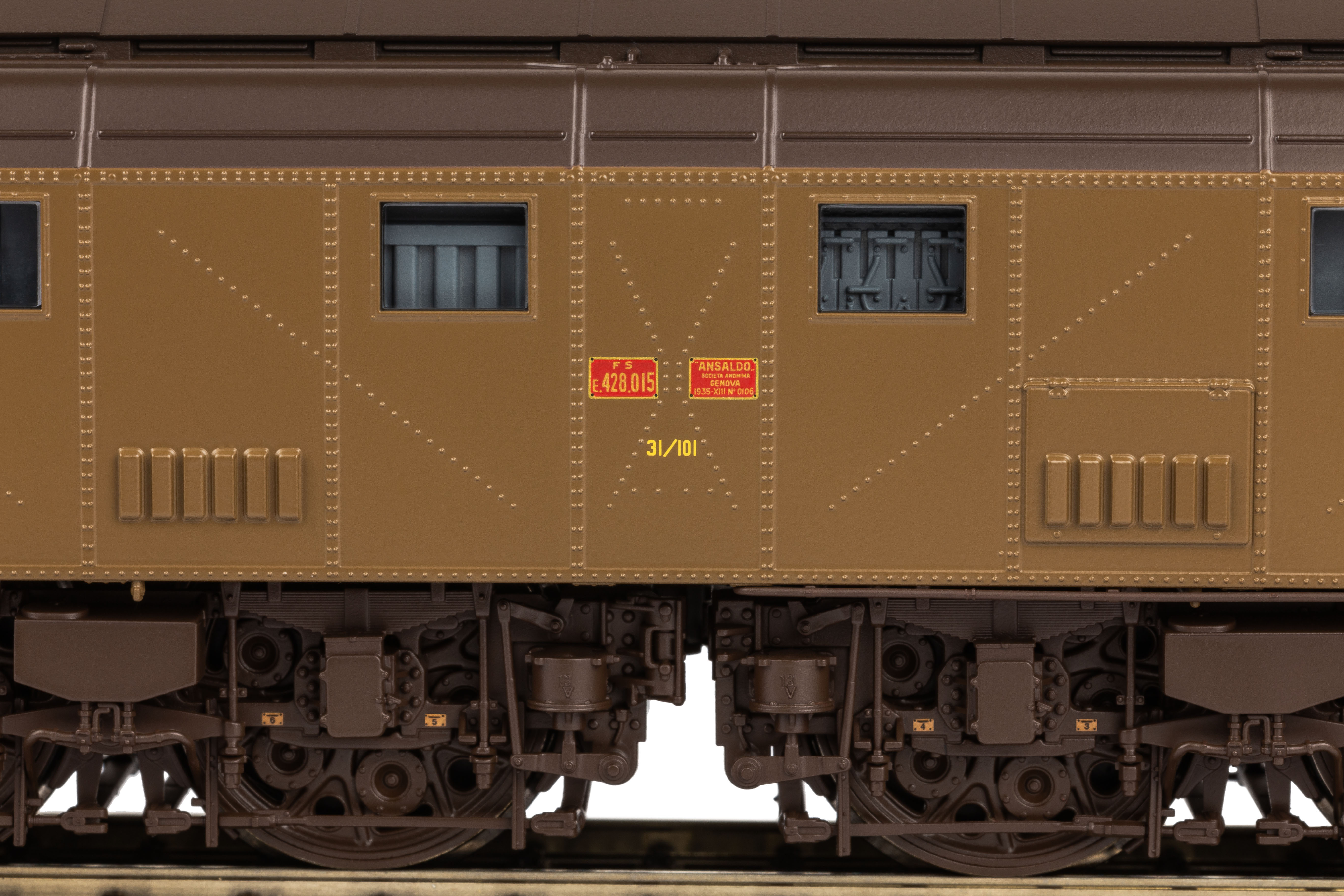 Neuheit 2024: Formvariante der BR E.428 der FS in Epoche III mit zwei Vorbauten. Die italienische E.428 ist auch im Modell eine stattliche Erscheinung: Der lang gestreckte Lokkasten und die wuchtigen Vorlaufdrehgestelle prägen das Bild. Diese Attribute und die markant gestaltete Front gibt das neue PIKO Modell ausgezeichnet wieder. Die Seitenfläche wird durch feine Nietbänder und die bündig eingesetzten Maschinenraumfenster strukturiert. Im Gehäuse arbeitet ein leistungsstarker fünfpoliger Motor. Zwei präzise gewuchtete Schwungmassen verbessern die Laufeigenschaften und helfen über kleine Kontaktschwierigkeiten der Gleise hinweg. Das Modell besitzt ab Werk einen PSD XP Sound-Decoder mit größtmöglichem Lautsprecher und verfügt über verschiedene Beleuchtungsfunktionen.
