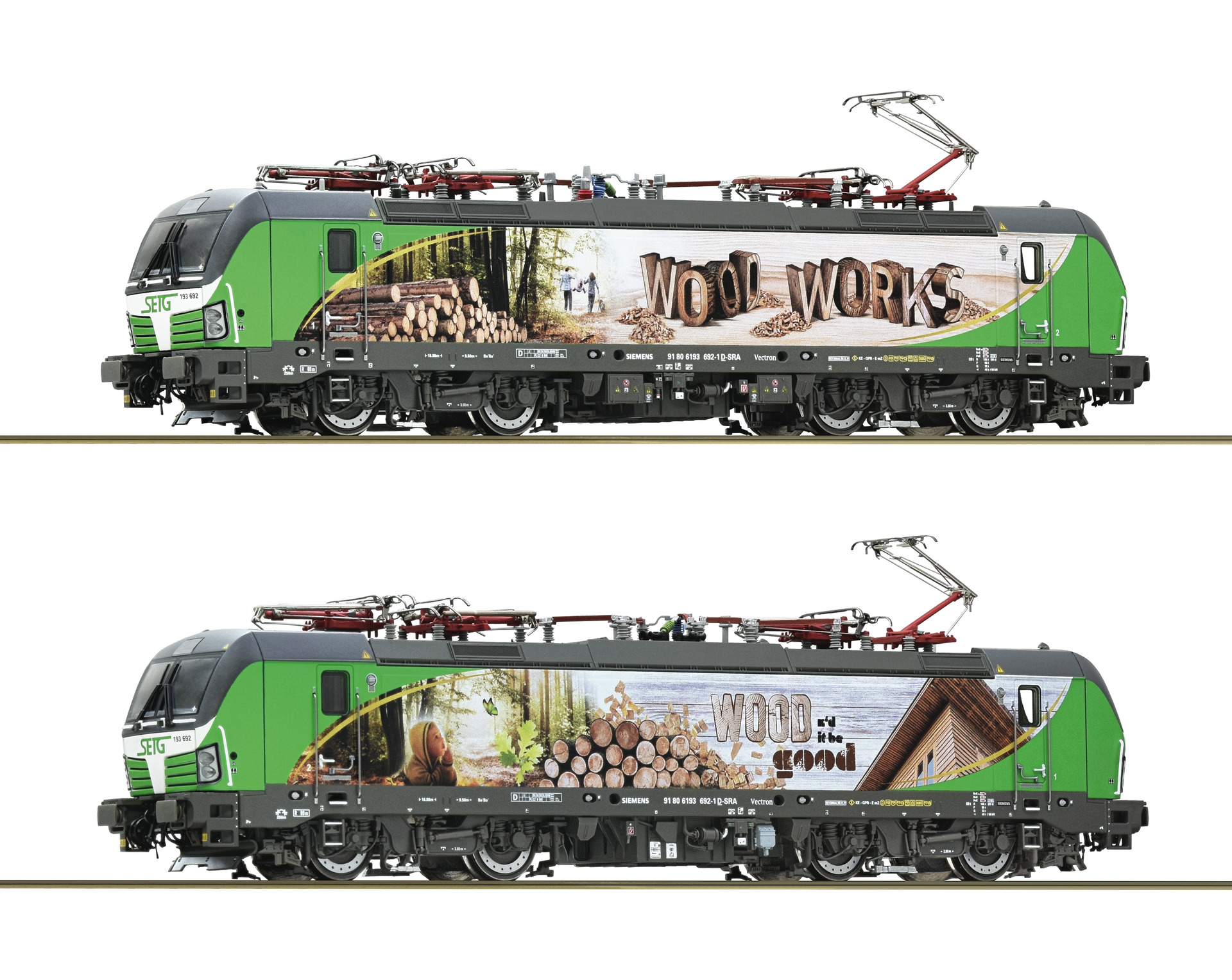Elektrolokomotive 193 692 äWood Works“ der Salzburger Eisenbahn Transport Logistik (SETG). - Modell exklusiv bei ROCO erhältlich - Mit geschwungenem Türgriff - Beide Seitenwände mit unterschiedlicher Gestaltung - Aufwendige Bedruckung im äWood Works“-Design - Einsatz im internationalen Güterverkehr - Mit detaillierter Dachgestaltung - Im Digitalbetrieb mit schaltbarem Fernlicht und einzeln schaltbarem Spitzen- oder Schlusslicht und Führerstandsbeleuchtung Im April 2022 präsentierte die Salzburger Eisenbahn Logistik GmbH in Salzburg die neue Vectron-Mehrsystemlokomotive 193 692. Der Firmentradition entsprechend ist die Lokomotive dem Thema äWood works“ gewidmet. Sie verkündet damit die Botschaft vom Werkstoff Holz in seinen vielen Facetten. Ob Rundholz, Schnittholz, Hackgut usw. – Holz ist auch eines der wichtigsten Transportgüter des international tätigen Logistikunternehmens.